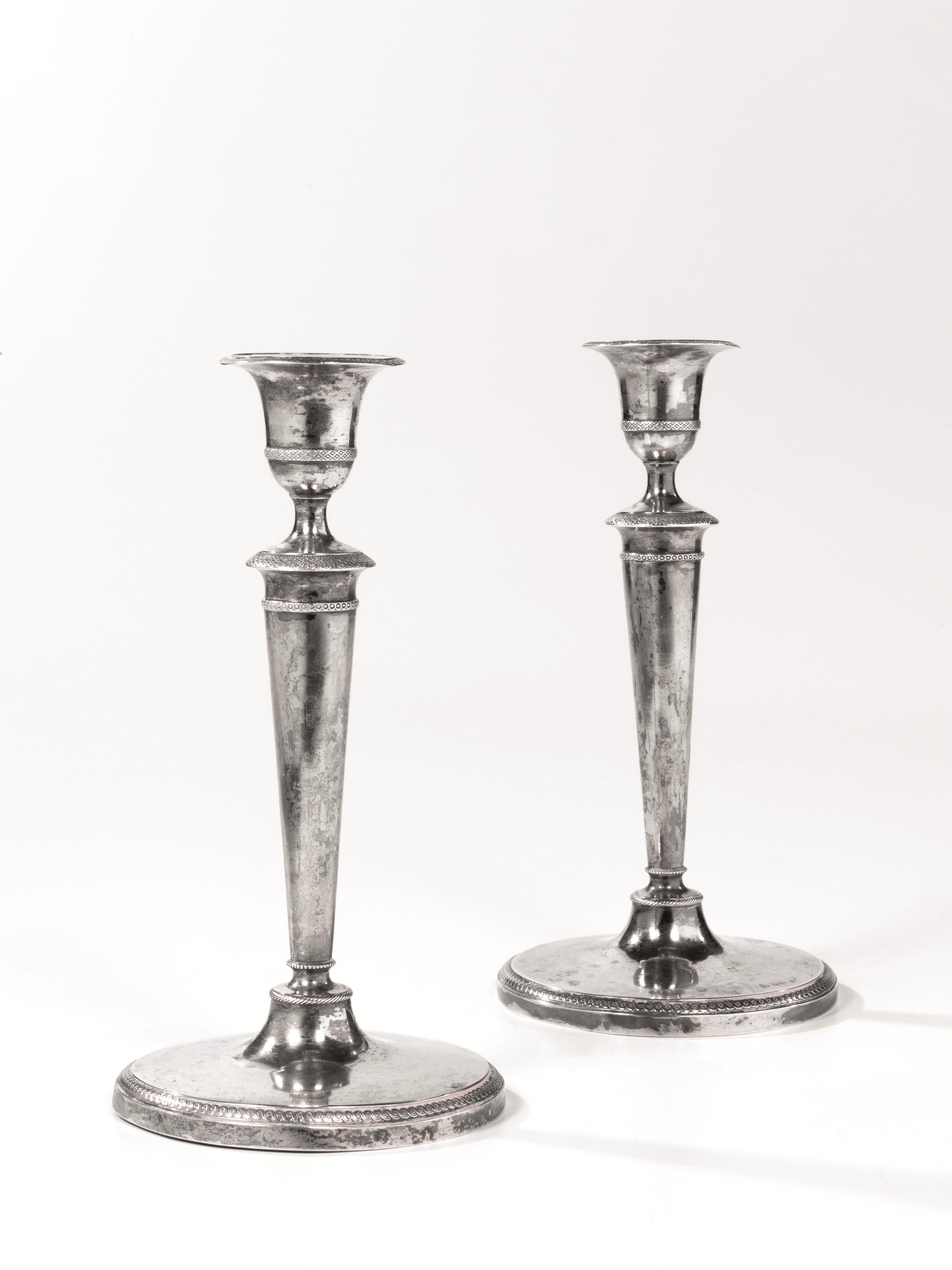 Lotto 414 | Coppia di candelieri, sec. XIX, in argento, fusto a colonna...