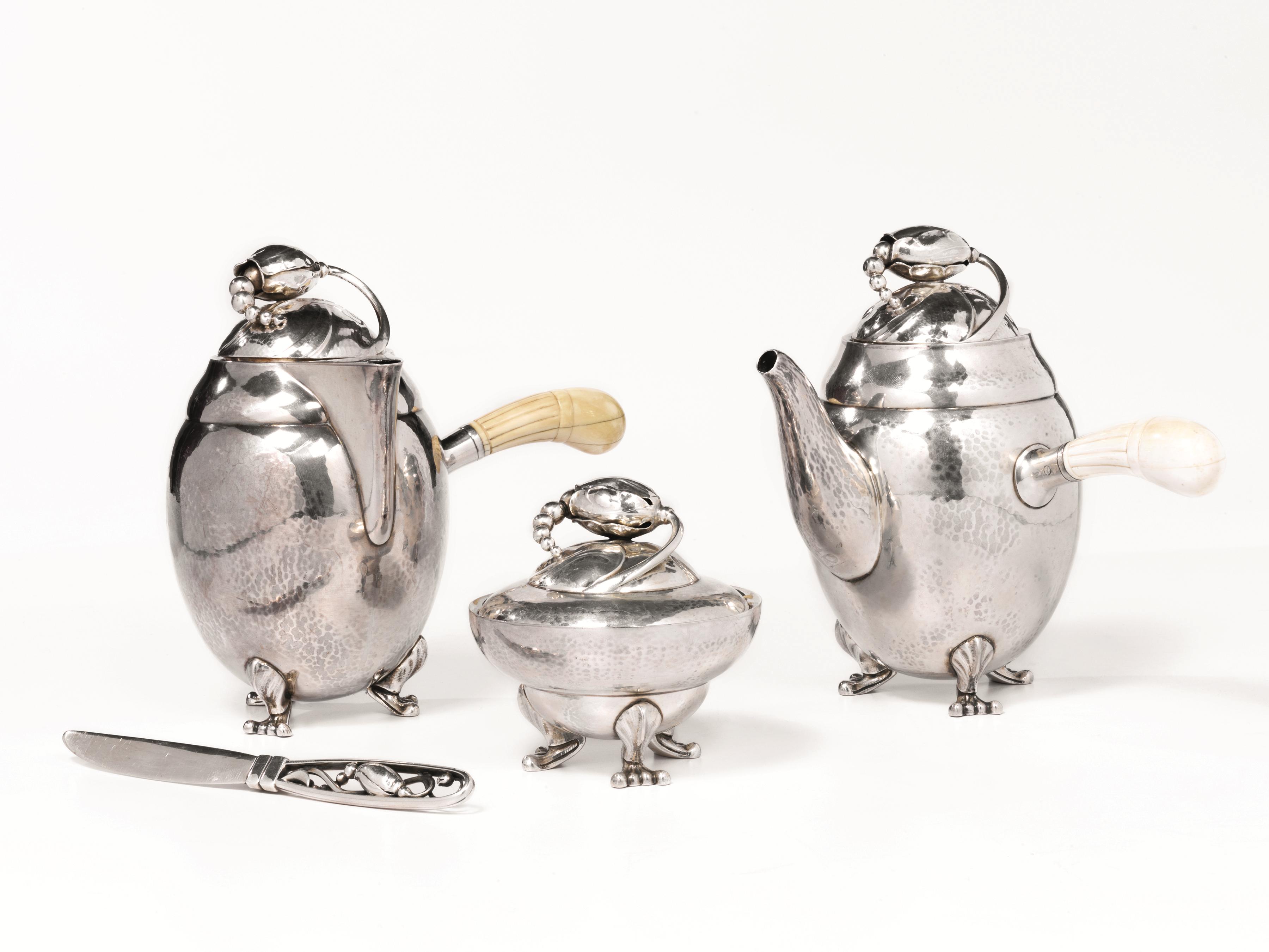 Servito da caffè Danimarca, sec. XX, facitore George Jensen, in argento sterling, composto di due caffettiere, una zuccheriera ed un coltellino da burro, prese dei coperchi modellati ad elementi fitomorfi, manici delle caffettiere in avorio, g 850 lordi (4)