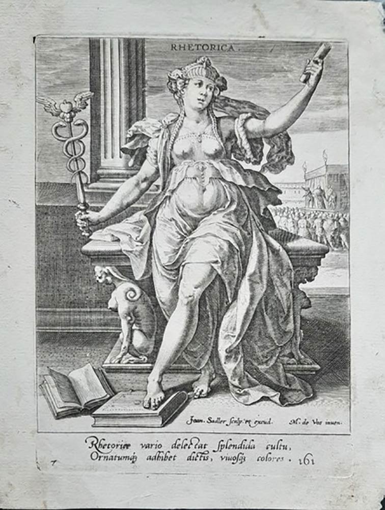 Allegoria della Retorica. Donna appoggiata ad un piedistallo ornato con sfingi, ha nella mano destra un caduceo e nella sinistra un rotolo o papiro ai piedi un libro, sullo sfondo alcune persone su un palco arringano una folla. Titolo in alto entro inciso, in basso a destra “Ioan Sadeler sculp. et excud. M. de Vos inven.”. In basso fuori inciso iscrizione: “Rhetoricae vario delectat splendida cultu. / Ornamentumquae adhibet dictis vivosquae colores” e i numeri 7 a destra e 161 a sinistra. Bella impressione con buoni margini.