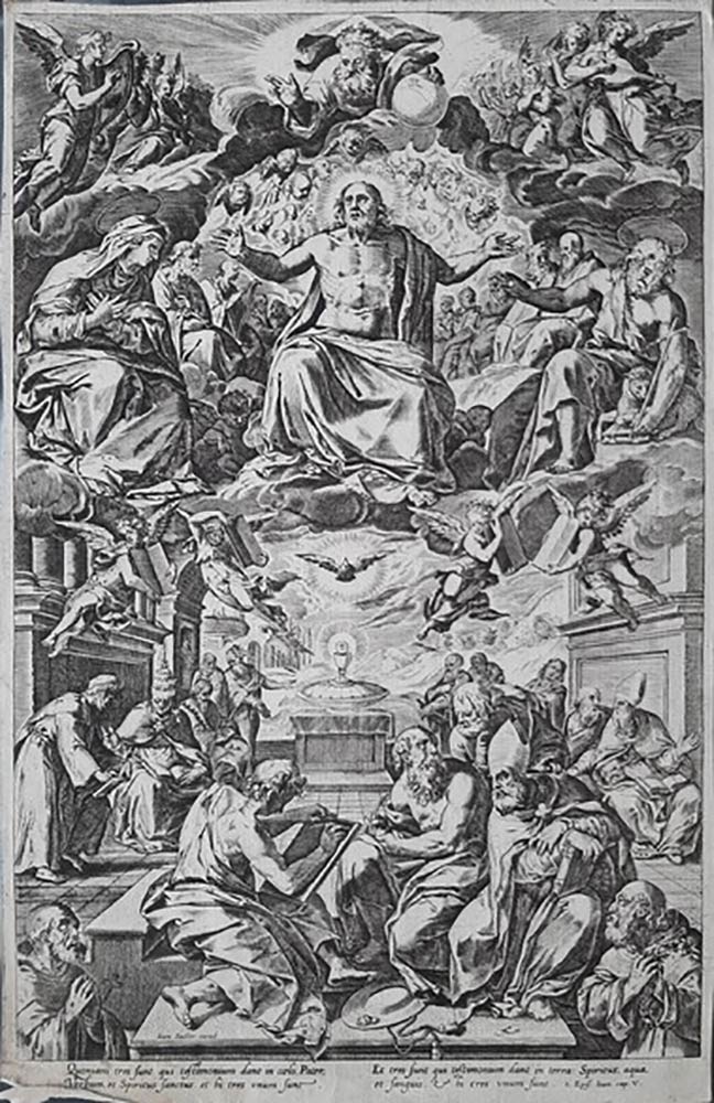 Animatissima incisione realizzata seguendo lo spirito della Controriforma e il dibattito sulla Trinità. In alto Dio con il globo dell’Universo, attorniato da angeli, più in basso Gesù con ai lati la Madonna e Giovanni Battista, sullo sfondo gli Apostoli, in basso al centro la pisside e l’ostia del sacramento della Comunione. Attorno preti, cardinali, frati e il papa che discutono sul sacramento della Trinità consultando le scritture. In calce iscrizione: “Quoniam tres sunt qui testimonium dant in caelo Pater / Verbum, et Spiritus Sanctus, ei hi tres sunt // et tres sunt qui testimonium dant in terra spiritus aqua / et sanguis, et hi tres unum sunt I Epis. Ioan. Cap. V”.