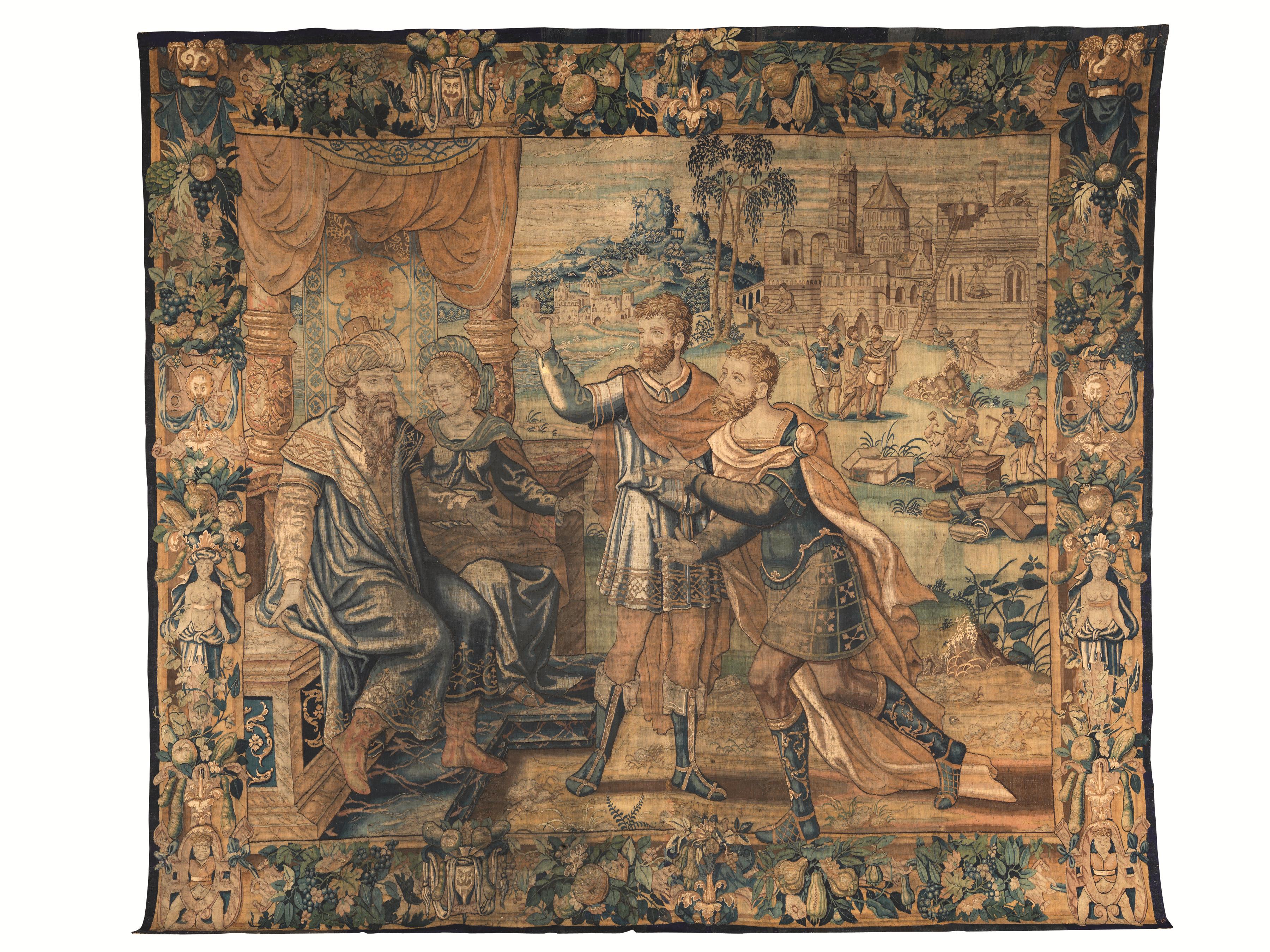 Arazzo, manifattura di Audenarde, seconda metà sec. XVI, raffigurante la costruzione del tempio di Salomone, cm 355x390, alcuni restauri