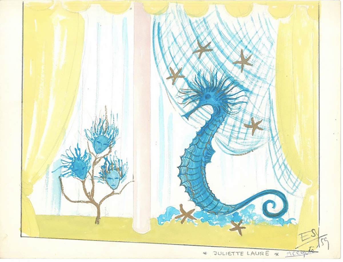 Opera fresca e colorata che rappresenta un cavalluccio marino, di profilo, circondato da stelle dorate sul lato destro. La figura del cavalluccio blu è circondato dalle cortine vivaci che costruiscono la cornice. Nell'angolo sinistro c'è un alberello con tre frutti-mascheroni. Sul margine inferiore, in maiuscolo, compare il nome di "Juliette Laure".