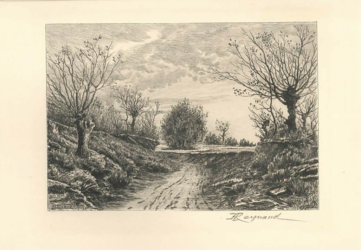 Opera realizzata nel 1909 da Henry Raynaud, allievo prediletto di Delâtre e socio della Sociètè des Artistes Françaises dal 1899. Acquaforte su carta giapponese. Firmata su lastra al margine inferiore sinistro e firmata a matita sul margine inferiore destro.In ottime condizioni, passepartout compreso. Rappresenta un trailo sterrato in campagna in autunno.