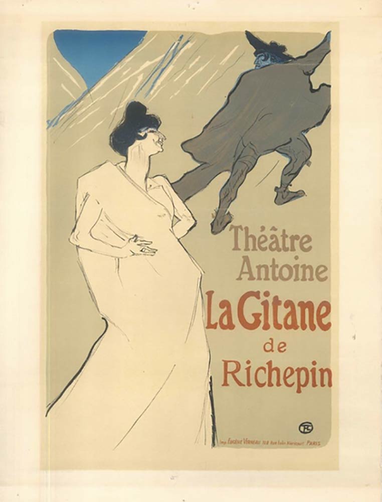 Poster cromolitografato, monogrammato su lastra sul margine inferiore destro dell'artista bohémien francese Henri de Toulouse-Lautrec. Titolo originale: Théâtre Antoine - La Gitane de Richepin. Una splendida riproduzione del famoso manifesto per "La Gitane", dramma in quattro atti di Jean Richepin. Lo spettacolo fu presentato per la prima volta al Theatre Antoine il 22 gennaio 1900. La stampa è stata disegnata da Lautrec, stampata da Eugène Verneau e pubblicata da Mourlot. In ottime condizioni, salvo qualche piccolo foro ai margini esterni, superiore ed inferiore. I colori vivaci e l'alta qualità della stampa e del soggetto rendono questa opera sempre alla moda.