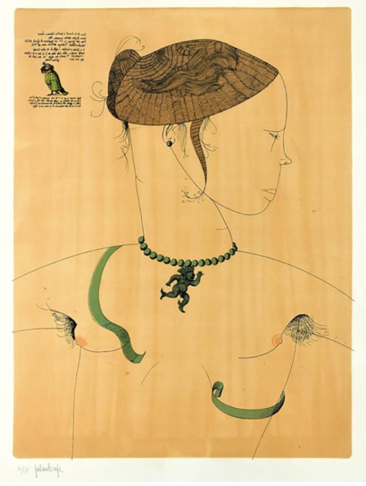 Rappresentando il amore dell'artista per la sua moglie Dorothea, questa stampa raffigura una donna di profilo che porta una collana con un ciondolo a forma di uomo. Il corpo femminile è avvolto da un serpente. Una lunga descrizione incisa su lastra in alto a sinistra.