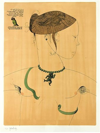 Acquaforte a colori, realizzata nel 1963 dal maestro italiano Gaetano Pompa. Firmata e numerata a matita in basso a sinistra. Questa impressione proviene da un'edizione limitata di 75 esemplari numerati in numeri arabi, più 20 esemplari numerati in numeri romani