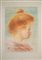 Opera d'arte molto bella e fresca che rappresenta una giovane donna di profilo. I colori sono delicati e e tenui, riflettendo l'eleganza della ragazza. Lo sfondo è realizzato con una tonalità di blu molto chiara, in contrasto con i capelli arancioni della donna.