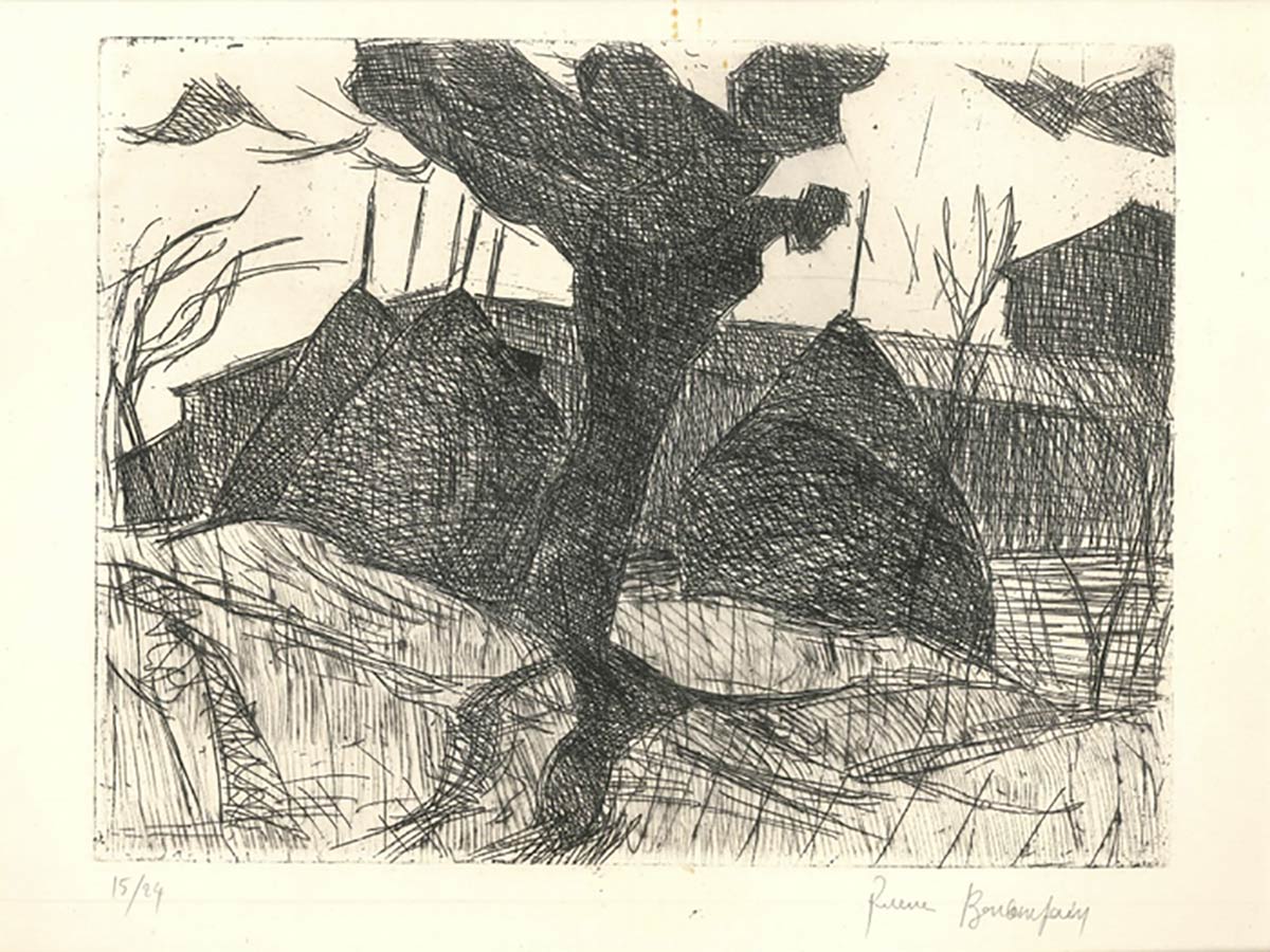 "Capanne" è un'acquaforte e puntasecca originale su carta color crema, numerata e firmata a matita sul margine inferiore da Pierre Boncompain. Edizione di 24 esemplari. In ottime condizioni salvo qualche piccola macchia sul margine superiore al centro. Passepartout incluso.