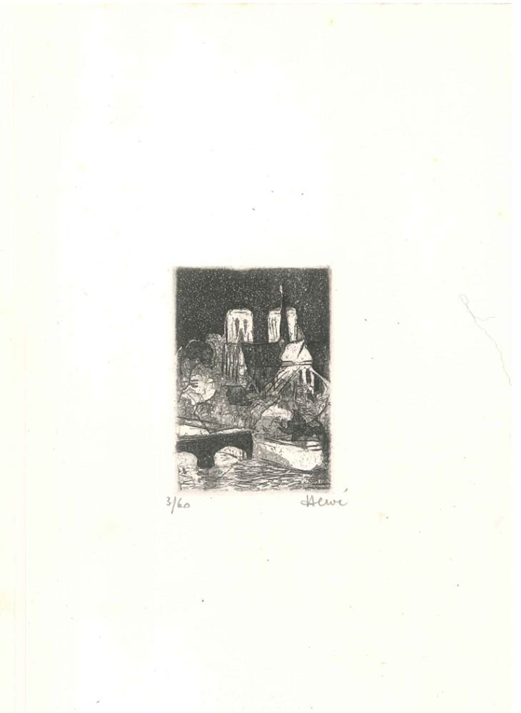 Opera d'arte molto piccola ma elegante che rappresenta un villaggio con edifici. L'acquaforte è stata realizzata dall'artista francese Jeannine Hervé (Morbihan, 1931), pittrice, acquarellista, disegnatrice, litografa, incisore (legno / bulino) e restauratrice d'arte. Dal 1936 al 1937, Jeannine Hervé studiò disegno e pittura con E. Robert e l'incisore Adolphe Beaufrère.