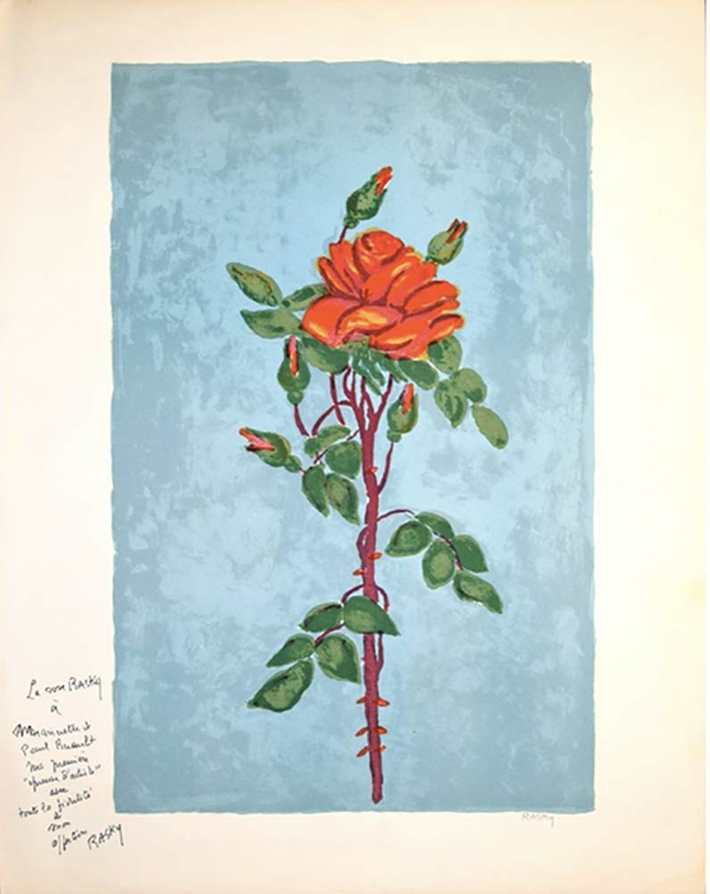 Opera d'arte molto colorata e vivace che rappresenta una rosa rossa su sfondo azzurro. L'opera è stata realizzata dall'artista francese Marie-Madeleine de Rasky (Algeri, 1897 - Parigi, 1982). L'artista rappresentò soprattutto fiori e nature morte. Fu la vedova di un autore di opere teatrali. Espose diversi ritratti di personaggi della società parigina.