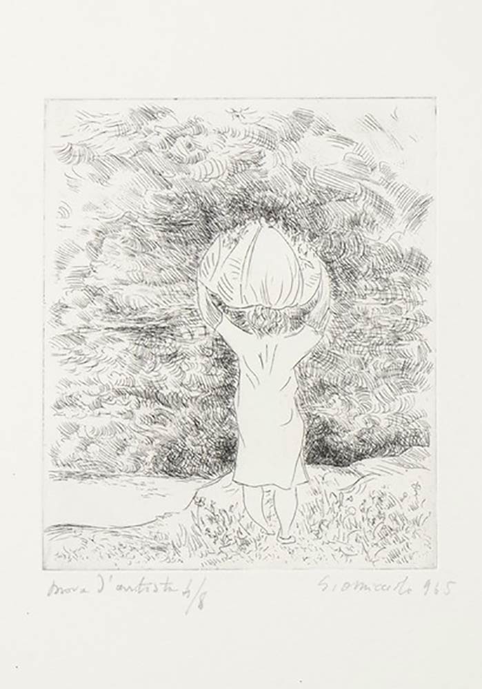 Una donna di spalle, firmata e datata a mattita in basso a dresta: G. Omiccioli 965, prova d'artista, tiratura 4/8.