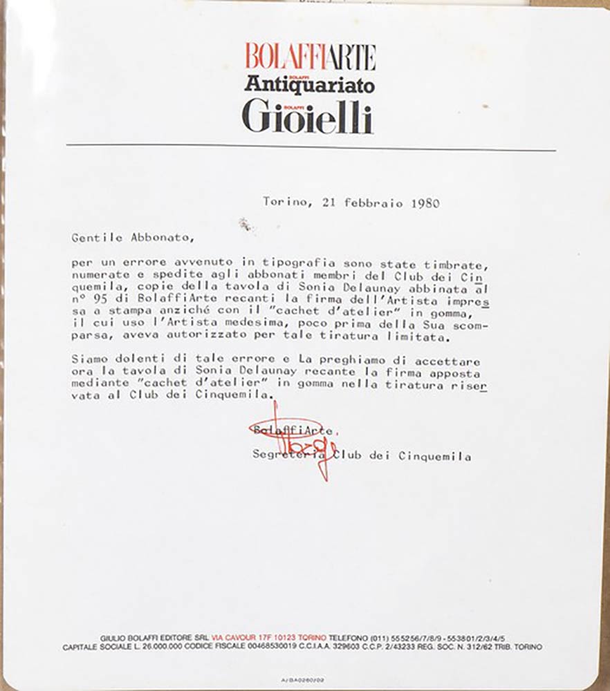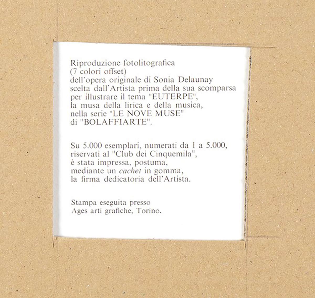 Sonia Delaunay scelta dall'artista prima della sua scomparsa per illustrare il tema "Euterpe" realizzata da Bolaffi Arte per i suoi abbonati, 5000 esemplari.