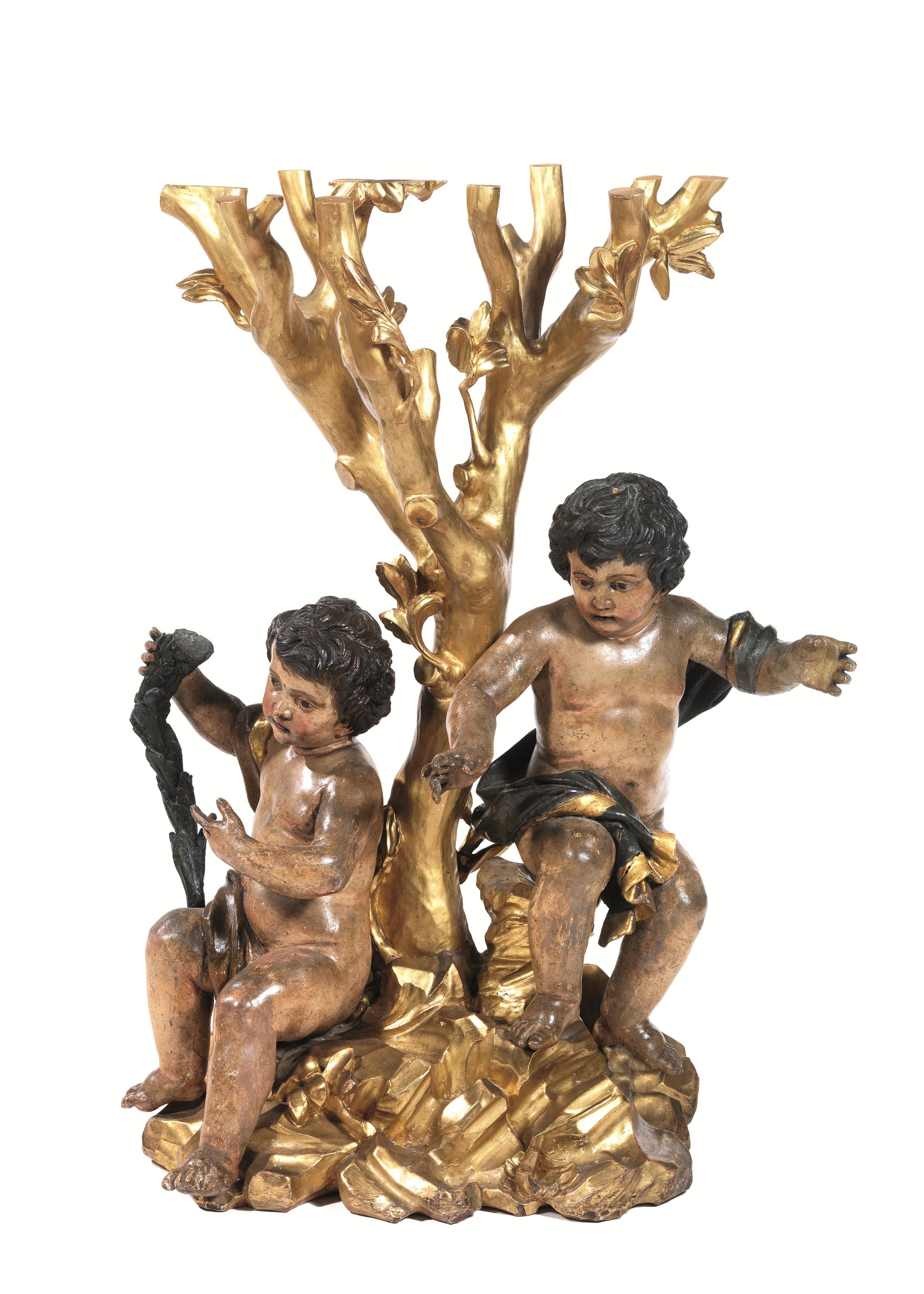 Fusto di gueridon, Roma, prima metà sec. XVIII, in legno scolpito, dipinto e dorato raffigurante un putto seduto su terreno roccioso alla base di un albero, cm 57x46x93, lievi danni