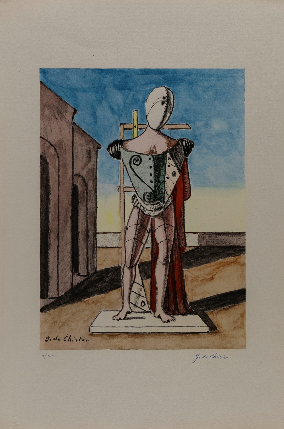 d. Giorgio De Chirico, Senza titolo, litografia a colori su carta, cm 52 x 35. Numerato in basso a sinistra. Firmato a penna in basso a destra: G. De Chirico