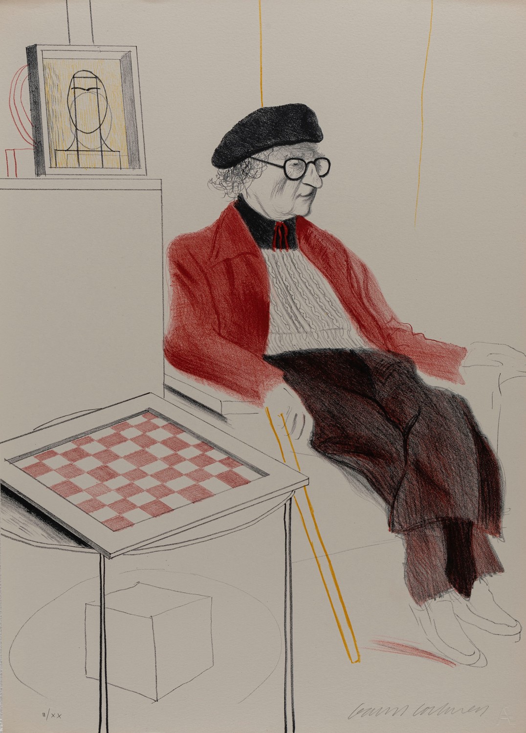r. David Hockney, Senza titolo, litografia a colori su carta, cm 52,5 x 37,5. Firmato in basso a destra: David Hockney. Numerato in basso a sinistra.