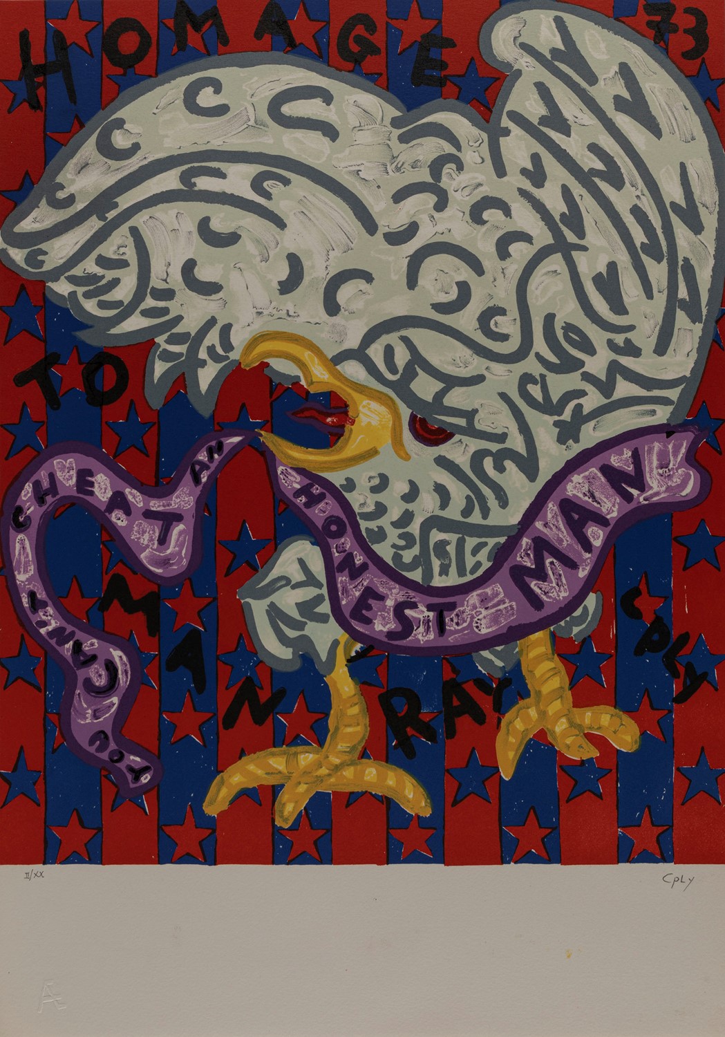 p. Bill Copley, Senza titolo, litografia a colori su carta, cm 50 x 35. Numerato in basso a sinistra. Firmato in basso a destra: Cply