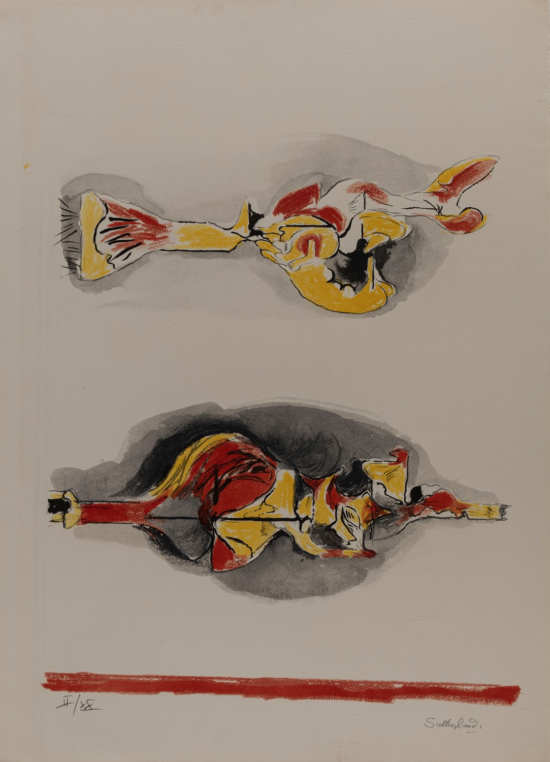 n. Graham Sutherlland, Senza titolo, litografia a colori su carta, cm 52,5 x 37,5. Firmato in basso a destra: Sutherland. Firmato in basso a sinistra