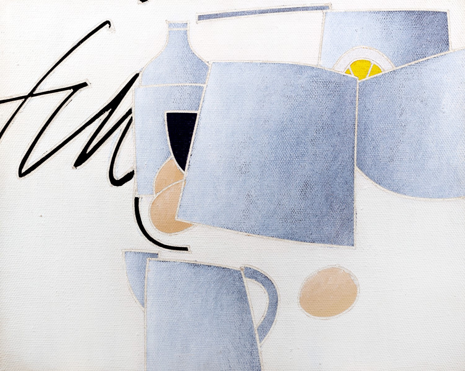 Firmato al verso: Emilio Tadini, Natura morta con la parola Fine 1979 con una dedica ad personam