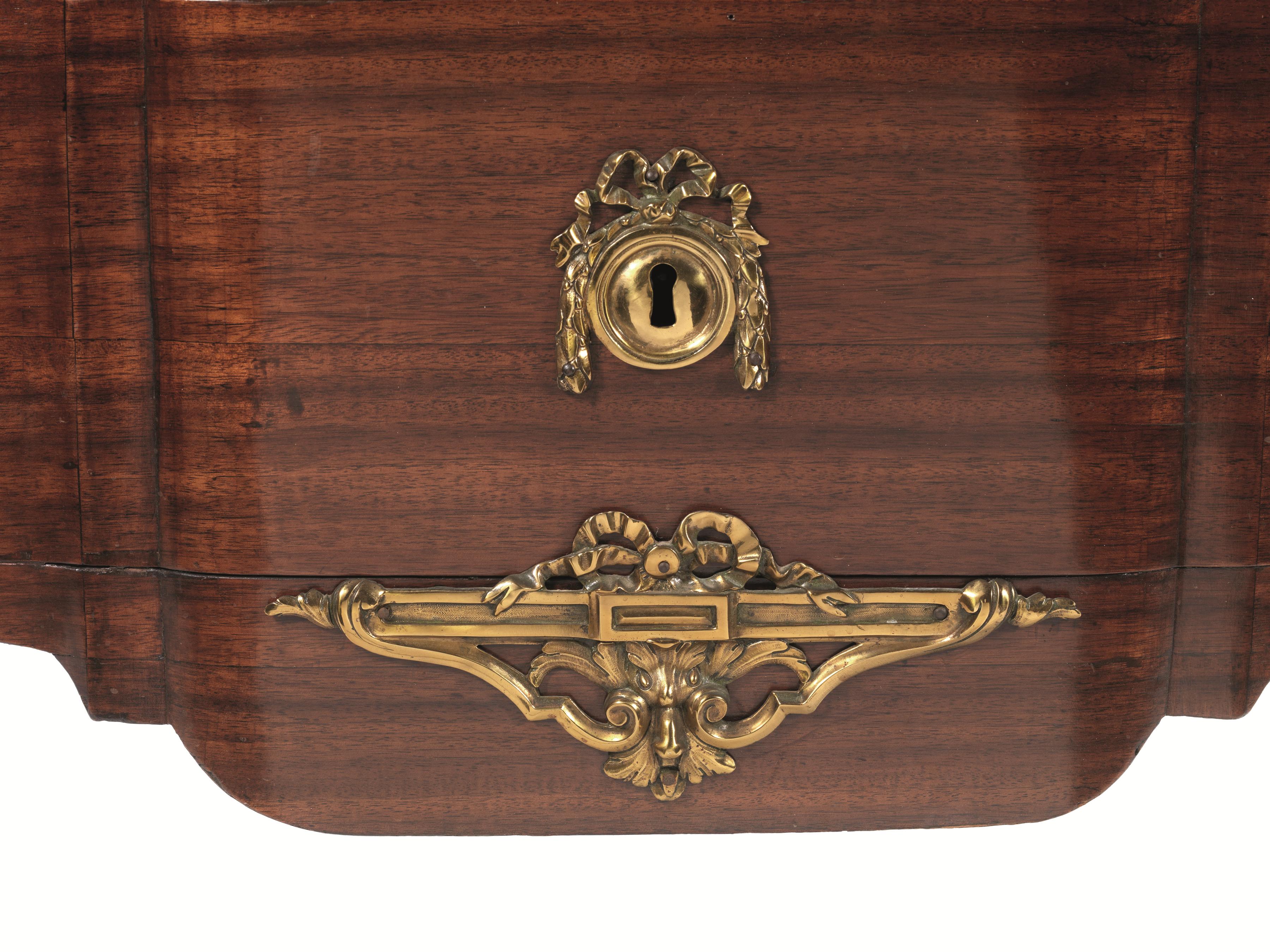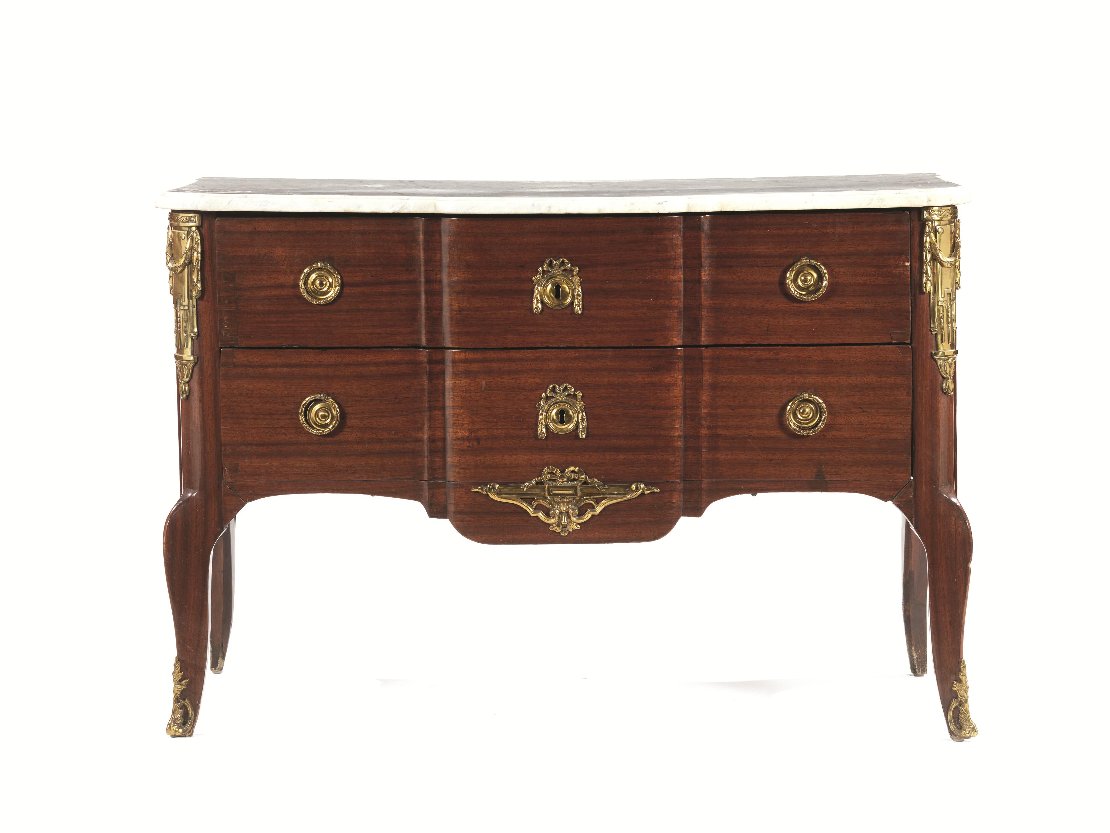 Commode à la greque, Francia, metà sec. XVIII, periodo Luigi XV, ebanista Lardin, in mogano con applicazioni in bronzo dorato, piano sagomato in marmo bianco, fronte a due cassetti, pendaglina sagomata, gambe mosse con scarpette in bronzo dorato, cm 128x62x86. Reca la firma Lardin sotto al piano