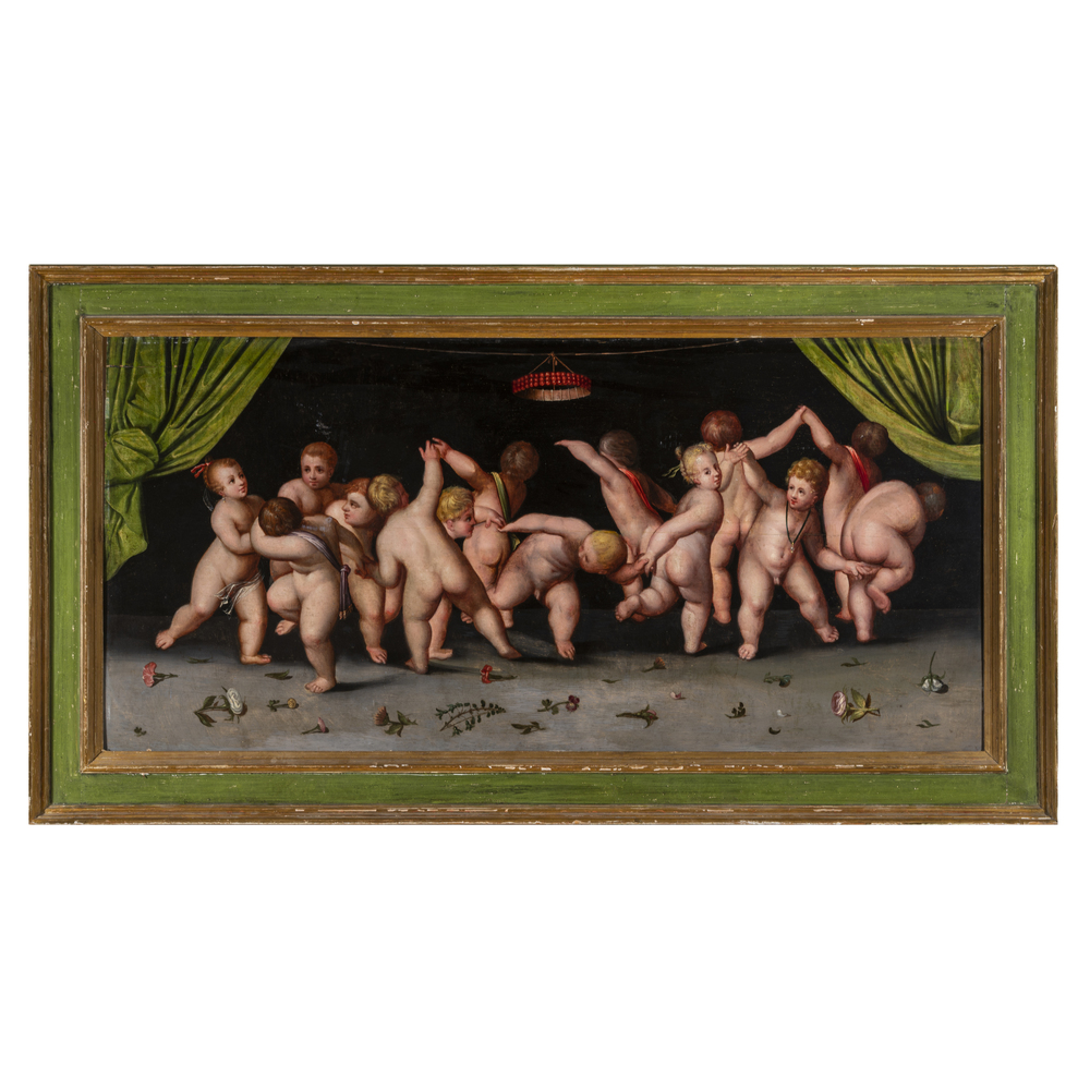 Il soggetto dei putti giocosi o danzanti è una ripresa dall’antico operata nel Rinascimento italiano, eseguita, tra gli altri, da Giovanni Antonio de’ Sacchis detto il Pordenone (Pordenone 1483/84 – Ferrara 1539), Raffaello Sanzio (Urbino 1443 – Roma 1520) e in scultura da Donatello (Firenze 1386 – 1466). Successivamente il tema ebbe fortuna a Venezia con Tiziano (Pieve di Cadore 1490 – Venezia 1576) e grazie a Jacopo Tatti detto il Sansovino (Firenze 1486 – Venezia 1570), il quale inserì, nel cuore della città, Piazza San Marco, un gioco di putti e ghirlande sulla facciata della Biblioteca Marciana. Con la divulgazione delle stampe, ricordiamo, tra le altre, “Cinque putti danzanti” di Amico Aspertini (Bologna 1475 – 1552) e“Cinque putti che danzano in cerchio” di Marcantonio Raimondi (Bologna 1480 – 1534), il tema ebbe vigoroso riscontro ben oltre i confini nazionali. Nella nostra opera, la scena risulta formata da tre cerchi di putti distinti, sapientemente raccordati tra loro. L’immagine emana tenerezza, spontanea giocosità e allegria. Dal punto di vista stilistico si nota un semplice e sapiente gioco chiaroscurale, l’esigua composizione scenica limitata al sipario raccolto lateralmente, infine, i contorni marcati delle figurine rimarca il levigato candore delle paffute carni. In considerazione di quanto detto l’opera mostra peculiarità con il complesso ambito definito école de Fontainebleau ove lo stile locale e fiammingo si esprimono nei modi del Rinascimento italiano, senza comunque perdere completamente la loro radice espressiva. Tra le importanti figure italiane, ricordiamo: Rosso Fiorentino (Firenze 1494 - Fontainebleau 1540), Primaticcio (Bologna 1504 - Parigi 1570) e Nicolò dell’Abate (Modena 1512 - Fontainebleau 1571). Tra gli artisti francesi e fiamminghi, per gli indubbi meriti di assimilazione e riproposizione originale delle novità italiane, vanno citati: Antonie Caron, Noel Jallier, Toussaint Dubreuil, Ambroise Dubois, Jacob Bunel, Guillame Dumée, Gabriel Honne