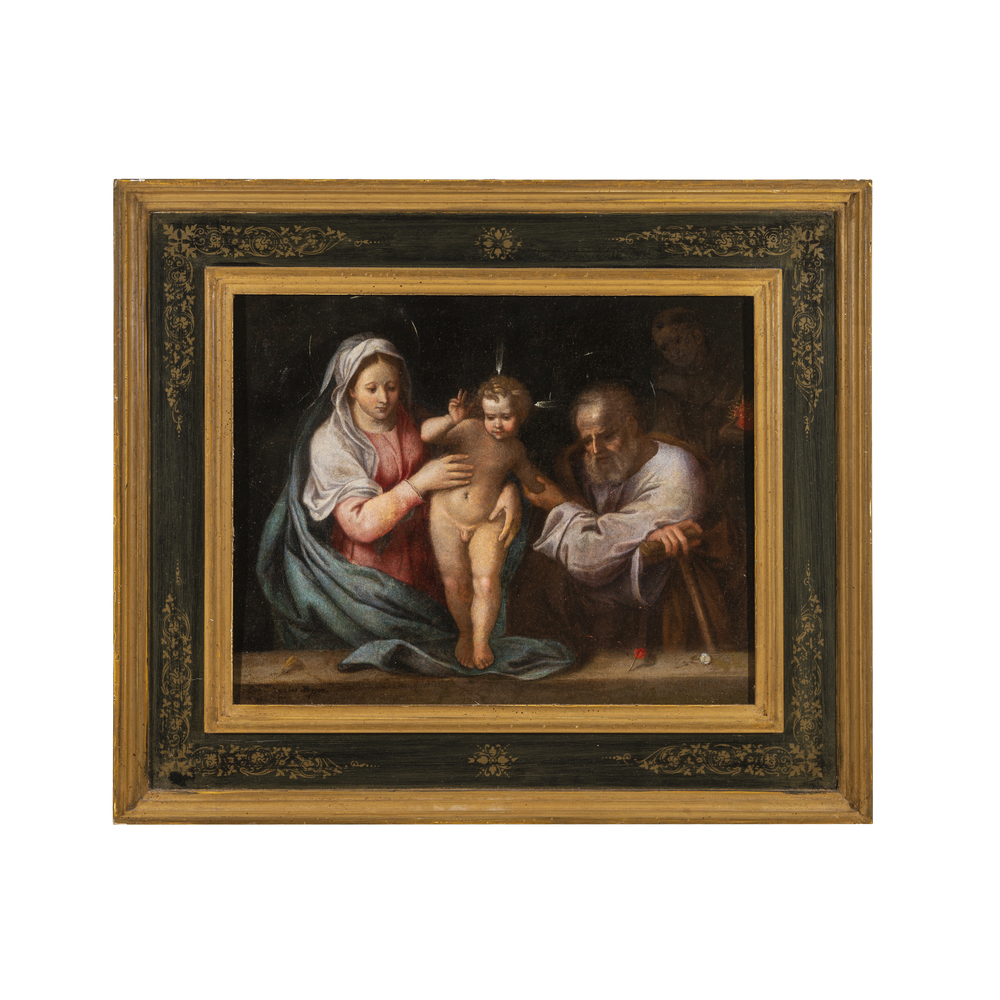 Bergamasco d’origine, Francesco Zucco si forma a Cremona presso Antonio e Vincenzo Campi, anche se le suggestioni maggiori le coglie da Giovan Battista Moroni. Coetaneo e amico di Cavagna e Salmeggia, coi quali forma talvolta sodalizi professionali. La sua attività è prevalentemente dedicata alla ritrattistica, anche se non sono rare le tele a carattere devozionale sparse nelle chiese di Bergamo e provincia. La sua produzione è qualitativamente apprezzata dalla critica, tanto da considerare Zucco una delle personalità di primo piano nel panorama dell'arte lombarda tra Cinque e Seicento. Il nostro dipinto mostra un’impostazione legata a schemi rinascimentali, mentre le figure evidenziano una plasticità e un dinamismo tipicamente manieriste. In particolare il piccolo Gesù Bambino, che pare incedere verso lo spettatore, accoglie certi modi veneziani e in particolare di Palma il Giovane, pittore attivo nella vicina Brescia e dintorni. Non mancano afflati dell’amico Enea Salmeggia e del suo linguaggio controriformato. Inoltre, è riscontrabile, in quel delicato gioco di luce che fa emergere le figure dallo sfondo tetro, l’influsso degli esempi contemporanei del Cerano e del Procaccini