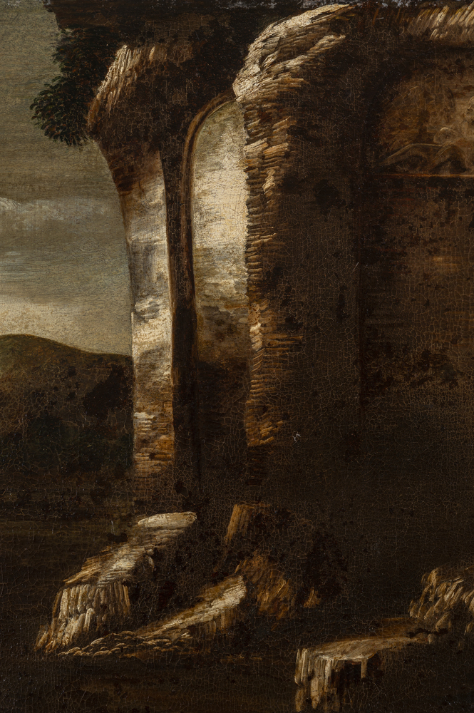 Allievo di Bernardo Strozzi, Antonio Travi è un raro paesaggista genovese della prima metà del XVII secolo. Influenzata dall'arte fiamminga, la sua pittura inizialmente segue l'arte di Goffredo Wals e del romano Agostino Tassi. Nelle sue opere alterna luminose e metafisiche scenografiche rovine con brani paesaggistici brulli e umbratili risolti con pennellate veloci e pastose La nostra coppia di tele risponde alle peculiarità stilistiche e tecniche del suo fare pittorico e si suppone una collocazione cronologica alla maturità del pittore, al sesto decennio, quando la sua produzione è numerosa e spesso realizzata con la collaborazione della bottega.
