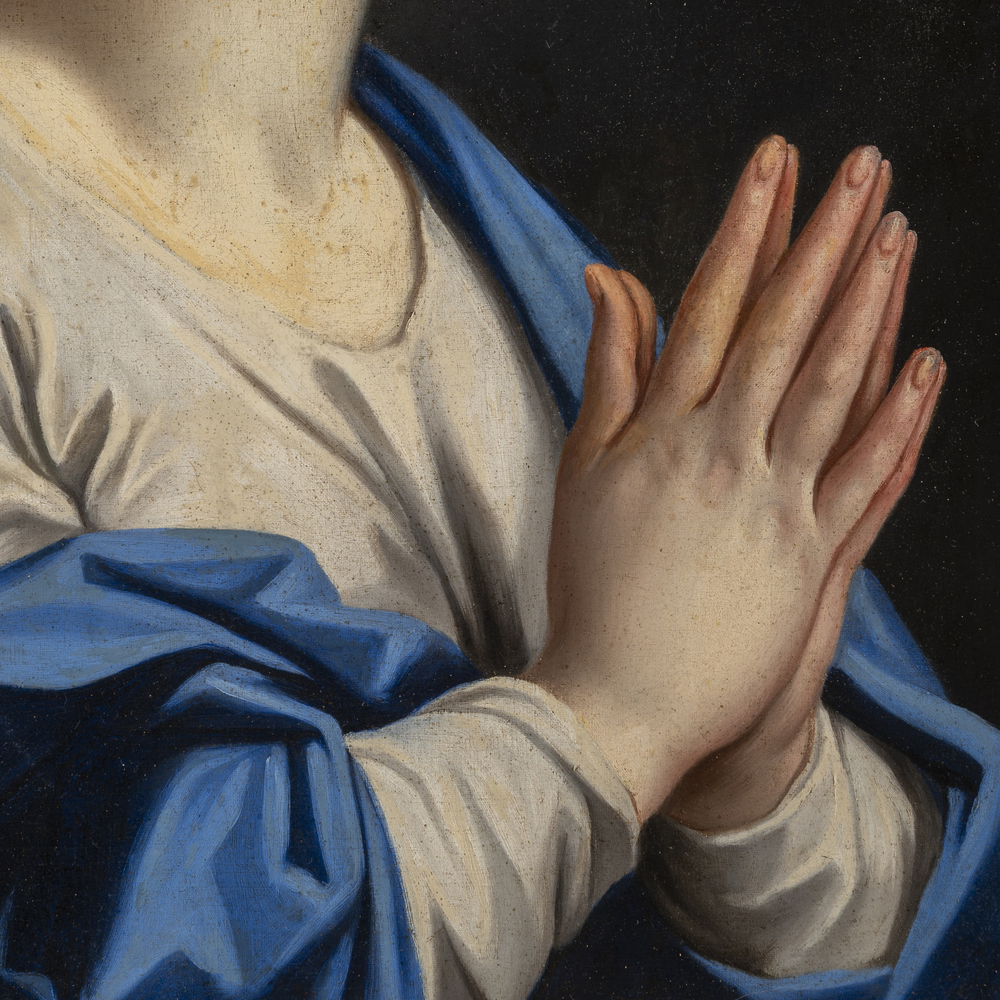 Nato e cresciuto a Bologna nel 1665, è studente del pittore Giovanni Maria Galli da Bibbiena, e completa la sua formazione nell’atelier di Carlo Cignani. A seguito del maestro, opera nei portici delle chiese di San Bartolomeo e dei Servi a Bologna, mentre a Parma lavora sugli affreschi del Palazzo del Giardino. Nel 1683 apre una propria bottega in città, dove molti pittori si formeranno: Tommaso Aldrovandini, Giacomo Boni, Francesco Caccianiga, Antonio Cifrondi, Pietro Antonio Avanzini e Gaetano Ferratini. Pittore di notevole bravura, è tutt’oggi ammirato per la sua finissima tecnica. La sua pittura, per mezzo della bellezza, vuol trasmettere il sublime senso spirituale, intellettuale, morale, estetico dei suoi personaggi. Sono molti i musei che espongono le sue opere: Dulwich Picture Gallery di Londra, Honolulu Museum of Art, Kunsthistorisches Museum e il Liechtenstein Museum di Vienna, Metropolitan Museum of Art di New York e in Italia i Musei Civici di Macerata, Museo Glauco Lombardi di Parma, Pinacoteca Nazionale di Bologna e il Polo Museale di Firenze. La Vergine orante in questione mostra la raffinata tecnica del Franceschini: pennellate liquide e precise, tonalità tenui rafforzate dall’intenso azzurro del manto della vergine. Il disegno del volto rivolto al cielo, in questo verso o in controparte, è un motivo assai ripreso nel corpus di Franceschini, e innumerevoli sono le figure in questa posa. Tra tutte, una in particolare è degna di nota: la “Madonna in preghiera”, ora a Parigi nella collezione Pierre Rosemberg (Vedi “Marcantonio Franceschini” di Dwight C. Miller, edizioni Artema 2001, pag. 242 figura 139)