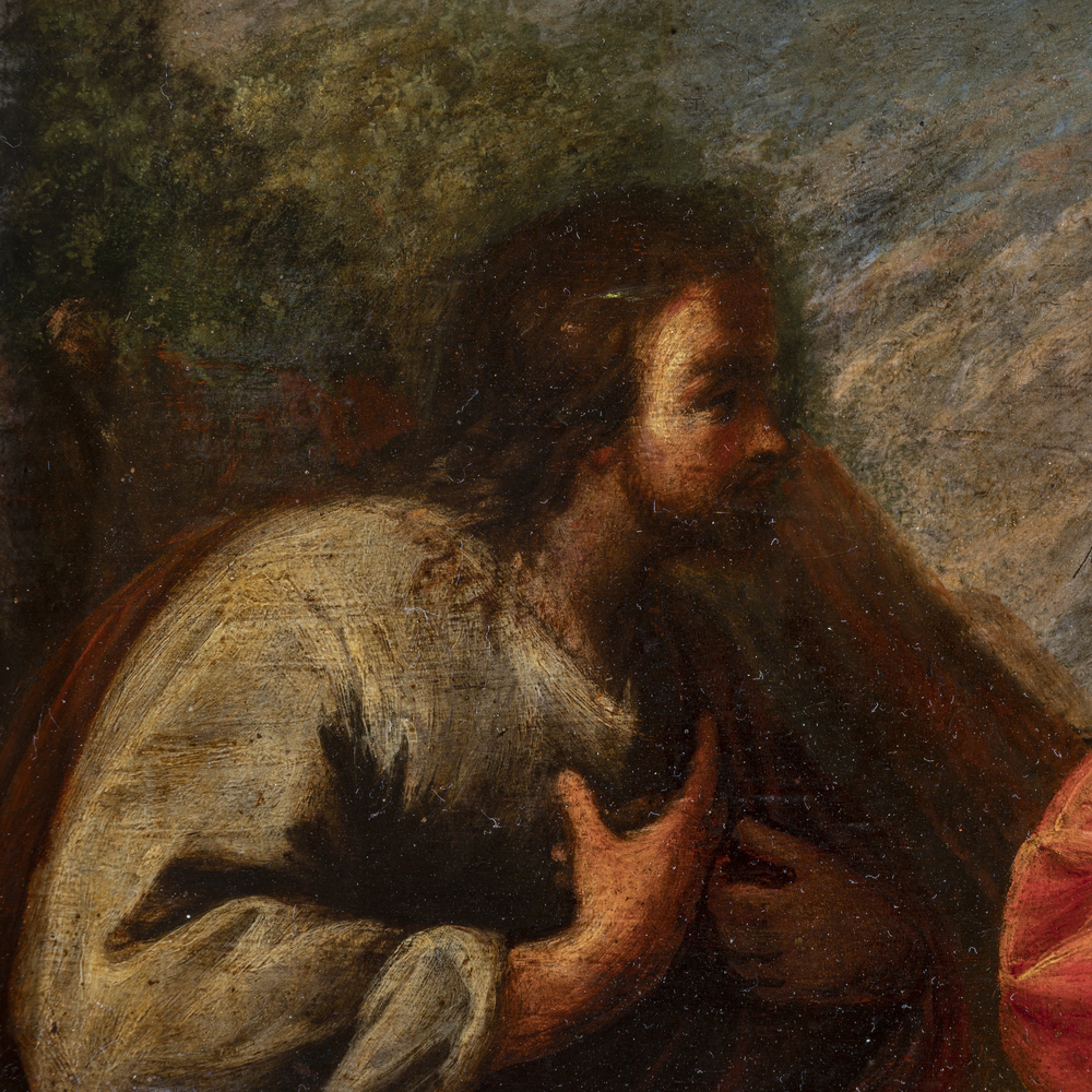 Siamo di fronte ad una tipica opera di Giuseppe Nuvolone, figlio di Panfilo e fratello Carlo Francesco, entrambi pittori. Si forma seguendo il fratello, e la sua incondizionata adesione alle scelte di stile fatte da Carlo Francesco ha reso in passato le due produzioni difficilmente distinguibili. In realtà la sua pittura diverge per l'uso du una tavolozza più chiara e, talvolta, per una vena di tragicità difficilmente riscontrabile in Carlo Francesco. L’opera in esame trova due puntuali riferimenti che rendono inequivocabile la sua paternità: “Rebecca ed Eleazar” olio su tela, 178.5 x 135 cm, passata a Milano da Christie’s il 29 novembre 2006, ove si ripete pressoché identica la metà di sinistra della nostra tavola con in primo piano le medesime figure del servo e Rebecca; la tela di bottega, 69 x 86 cm, conservata all’Accademia Carrara di Bergamo, ove è presente al centro del dipinto la stessa figura femminile che versa l’acqua nel pozzo. L’opera si presenta con una patina molto antica, ed è da sempre in collezione privata italiana