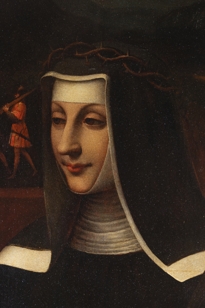 La Venerabile Maria Caterina Brugora è ritratta in puro stile rinascimentale, ossia a mezzo busto, con la sua veste da monaca benedettina. Sul capo porta una corona di spine, come segno di partecipazione alla Passione di Cristo. Nella mano destra tiene il Sacro Cuore di Gesù e il Crocifisso, mentre l’altra mano, poggiata sulle sacre scritture, regge una palma. Sulla spalla compare una colomba bianca, a simboleggiare la sua purezza. Sullo sfondo è raffigurato quanto riporta il cartiglio posto alla sommità della tavola, ovvero gli accadimenti del 1524 occorsi al Pusterla, alleato di Francesco II Sforza che, caduto in mano alle truppe francesi, riesce a fuggire miracolosamente e portarsi in salvo con l’intercessione della Brugora. L’opera viene riferita a Luini grazie ad un documento di un autore anonimo redatto tra il 1627 e il 1638, stagione nella quale inizia il processo di beatificazione della monaca benedettina. In questa scrittura si cita esplicitamente l’esistenza del dipinto eseguito da "ab excellentissimo eorum temporum pictore Lovino", che raffigura la beata Brugora assieme alla raffigurazione del miracolo che la monaca fece al nobile milanese Giovanni Battista Pusterla. Il dipinto ritenuto originale dalla critica, ovvero quello sopraccitato, già presso il complesso di San Simpliciano è conservato dal 2012 nei locali della Facoltà di Teologia a Milano. Altre versioni ritenute di bottega si trovano presso Villa Cagnola-Fondazione Ambrosiana Paolo VI a Gazzada; una realizzata su tela è conservata nei depositi della Galleria d’arte Moderna di Milano (inventario 5259)