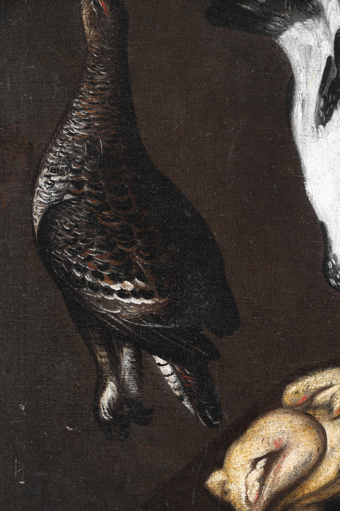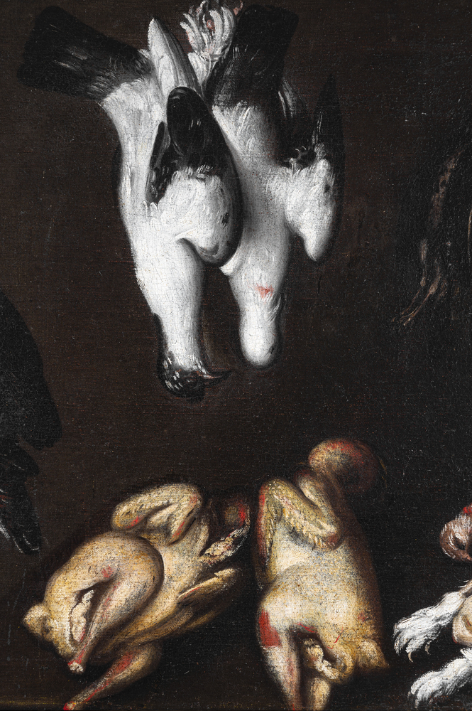 Evaristo Baschenis nasce a Bergamo il 4 dicembre del 1617. In gioventù si dedica agli studi per diventare sacerdote, al disegno e alla pittura. Lo troviamo operativo verso la metà del secolo, quando dipinge composizioni di natura morta di diversi soggetti: tappetti, cuscini ricamati, vasi istoriati, vasellame di cucina, funghi, polli, lumache; altri ancora con pesci, uccelli, verdure, cofanetti, conchiglie. Più tardi nasce l'attrazione per la composizione di strumenti musicali, soggetto che gli ha consentito di raggiungere la sua più alta espressione artistica. La nostra opera rappresenta vari uccelli appesi su fondo scuro, tema ricorrente per Baschenis, che grazie a questo fondale fa risaltare, con pennellata sicura e cromaticamente vibrante, il piumaggio delle bestiole. Se da una parte colpisce la naturalezza e precisione “nordica” nella descrizione accurata degli uccelli, dall’altra si evidenzia il realismo, tanto che i suoi uccelli spennati impattano con l’osservatore per la loro impietosa crudezza