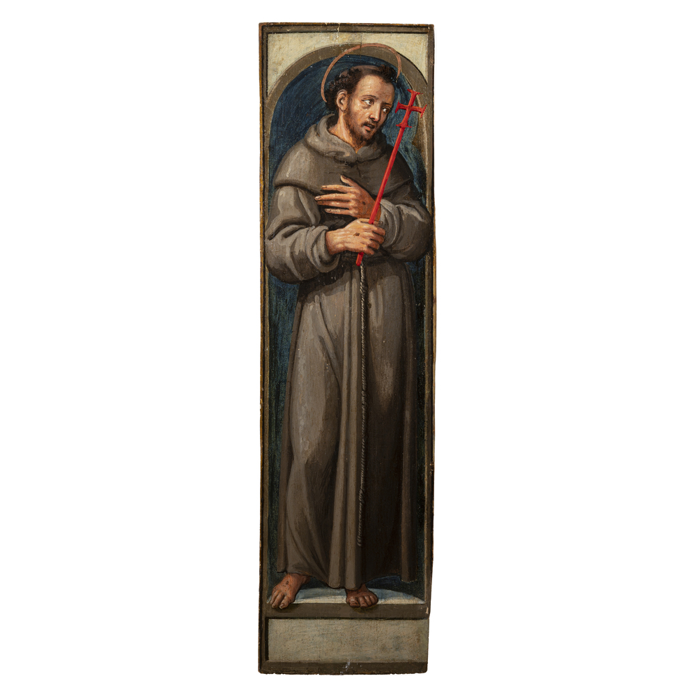 La data di nascita di questo pittore e frate dell'Ordine Carmelitano non è nota, come non è certa la sua attività bresciana prima dello spostamento a Firenze. Nel 1491 è ordinato accolito e nel 1494 sacerdote, ma, per dedicarsi alla pittura, nel 1498 venne dispensato da altre attività inerenti la vita conventuale con l’obbligo di onorare le le festività e l'obbligo di versare parte dei proventi. Le sue prime opere toscane denunciano una cultura prospettica di tipo bramantesco, anche se denotano la sua attenzione per suggestioni derivate dall'ambiente fiorentino e, in particolare, da Andrea del Castagno. I pagamenti versati da Girolamo in questo arco di tempo indicano che la sua attività si divideva tra una produzione minore, quale la decorazione e la doratura, e quella di ambito più specificatamente pittorico, legato a opere non sopravvissute. Nel 1519 Girolamo da Brescia esegue una delle poche opere giunte a noi, ovvero il trittico raffigurante la Natività e i ss. Francesco e Bartolomeo con due donatori, conservato dalla fine del XIX secolo a Savona presso la Pinacoteca Civica, opera firmata e datata nello scomparto centrale, entro un cartellino affisso alla capanna del presepio "Opus fr(atr)is Hiero(n)imy de Brixia. carmelitae. 1519.28.aprilis". In questo suo capolavoro fra Girolamo tradisce i suoi modelli lombardi con la rappresentazione prospettica e nelle scelte luministiche, specie quelle della tavola centrale, ove riecheggiano gli influssi di Vincenzo Foppa e di Giovanni Gerolamo Savoldo. Nella presente tavola i due santi sono facilmente riconoscibili grazie ai loro attributi iconografici: il saio bruno, il cingolo, il crocifisso e le ferite delle stigmate di San Francesco; l'abito francescano, il libro e il giglio bianco di Sant'Antonio da Padova. Entrambe le figure presentano un’elaborazione chiaroscurale ben orchestrata, che evidenzia il largo panneggio del saio. Le due figure si trovano all’interno di piccole nicchie, la cui profondità è data dal pavimento semicircolare. Un'ulteriore fonte di profondità è data dalla posizione dei piedi dei santi, che avanzando lievemente emergono dal piano d’appoggio e amplificano il senso spaziale. Entrambi i santi sono rappresentati con sguardo meditabondo: San Francesco, assorto, volge lo sguardo alla croce che tiene in mano, mentre Sant’Antonio è immerso nella lettura del libro. Un paragone convincente si può ritrovare nel San Francesco della sopraccitata pala savonese e nel Beato Giovanni Colombini, presente nell’affresco della chiesa di San Cristo a Brescia