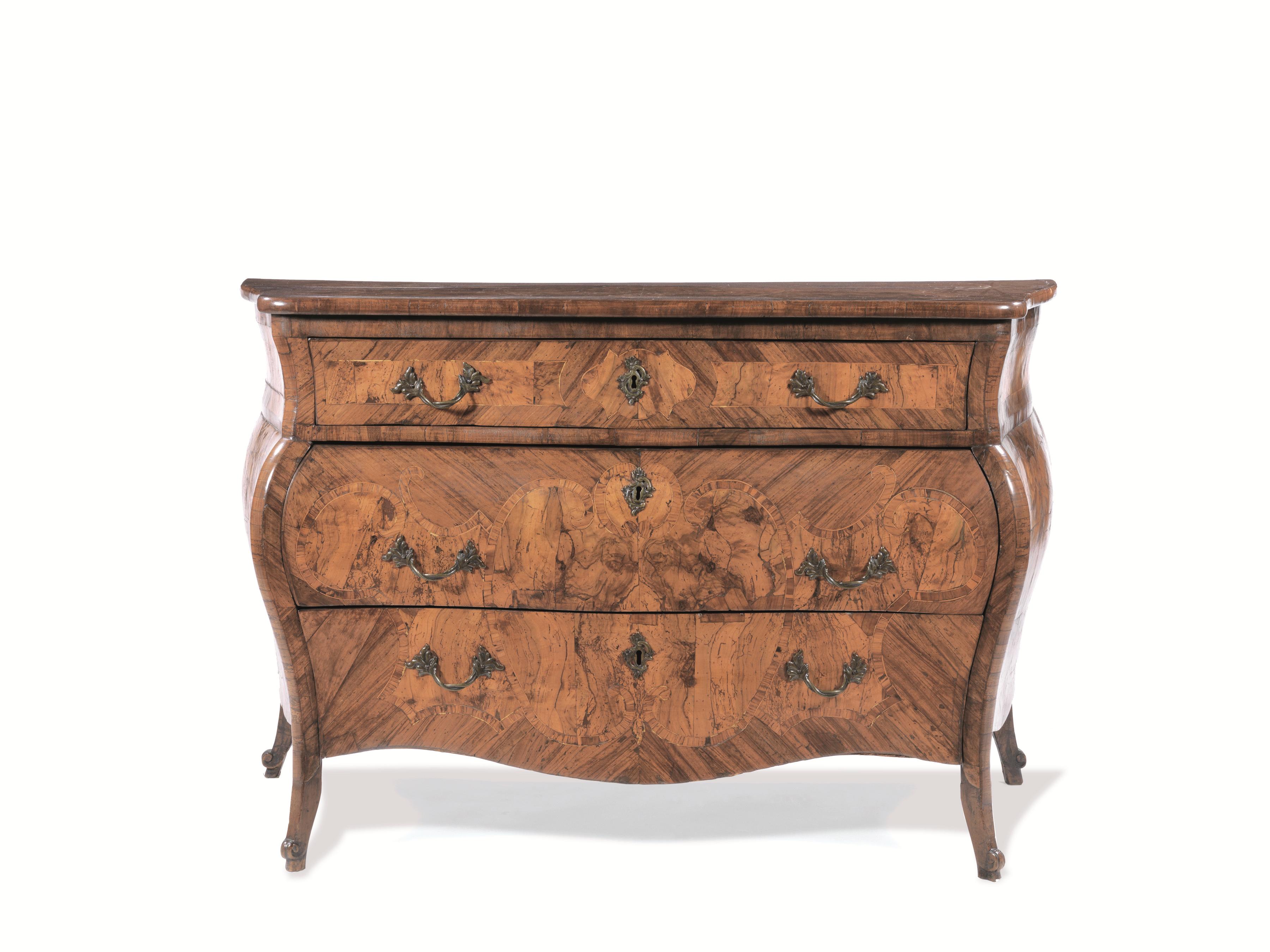 Cassettone, Lombardia, metà sec. XVIII, in noce e radica di olivo, piano sagomato non pertinente, fronte e fianchi bombati e decorati da riserve sagomate, un cassetto nella fascia e due sottostanti, gambe mosse piedi a ricciolo stilizzato, cm 143x62x90