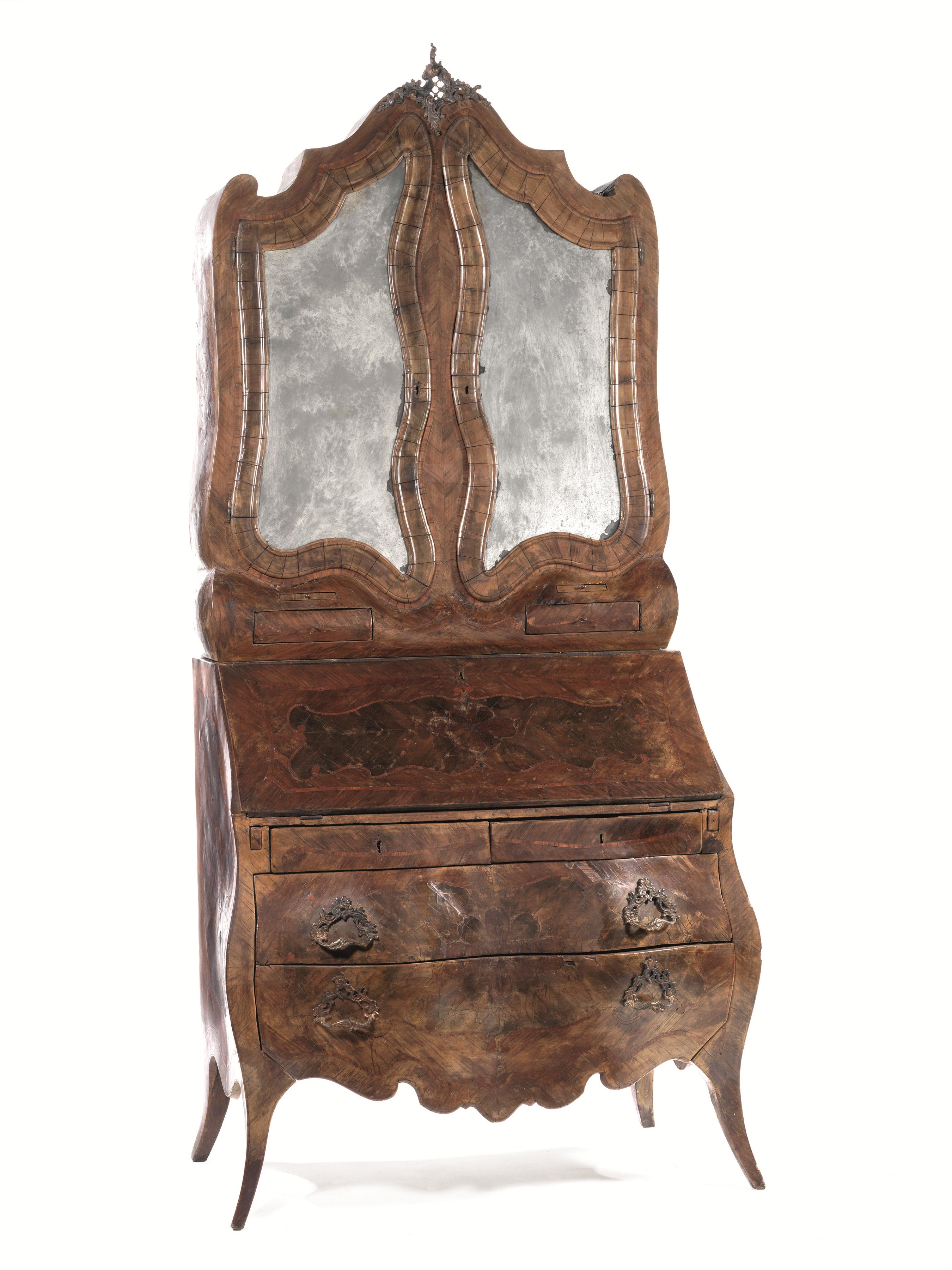 Bureau-trumeau, Genova, metà sec. XVIII, in noce intarsiato in bois de rose e bois de violette, corpo superiore con cappello sagomato e cimasa traforata in bronzo, due sportelli a specchio, due cassettini e due pianetti porta candelieri, parte inferiore con sportello a ribalta, scarabattolo interno con cassetti e vani a giorno, fronte e fianchi bombati e decorati da motivo a quadrifoglio, due cassetti appaiati sotto al piano e due sottostanti, pendaglina sagomata frontale e laterale, gambe a sciabola, cm 104x51x239, da restaurare