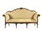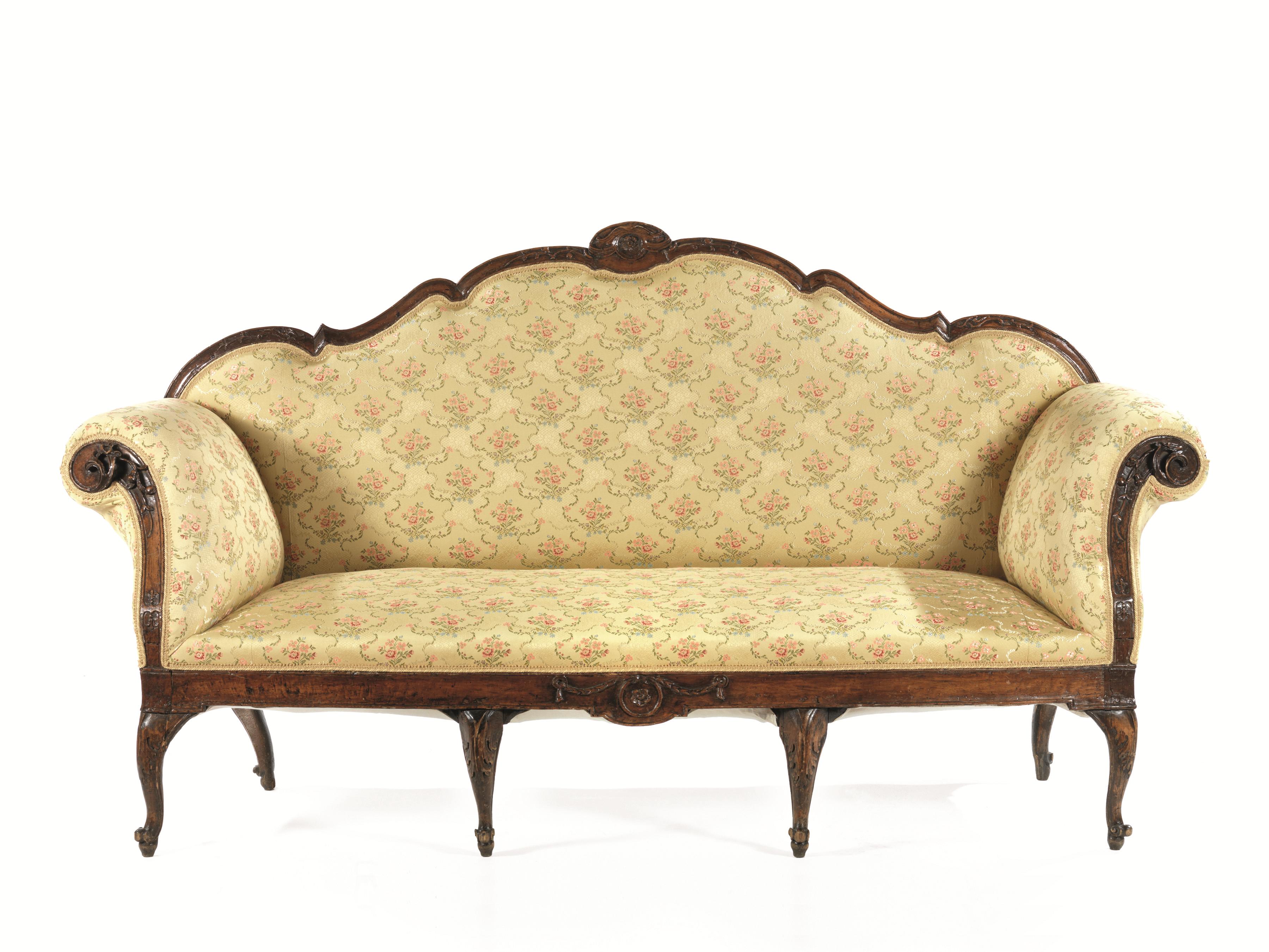 Divano a ventaglio, Veneto, 1770 circa, in noce intagliato, spalliera sagomata, braccioli a volute decorati da tralci fitomorfi, fascia centrata da festone, gambe mosse su piedi a ricciolo, ricoperto in seta operata gialla, lungh. cm 216