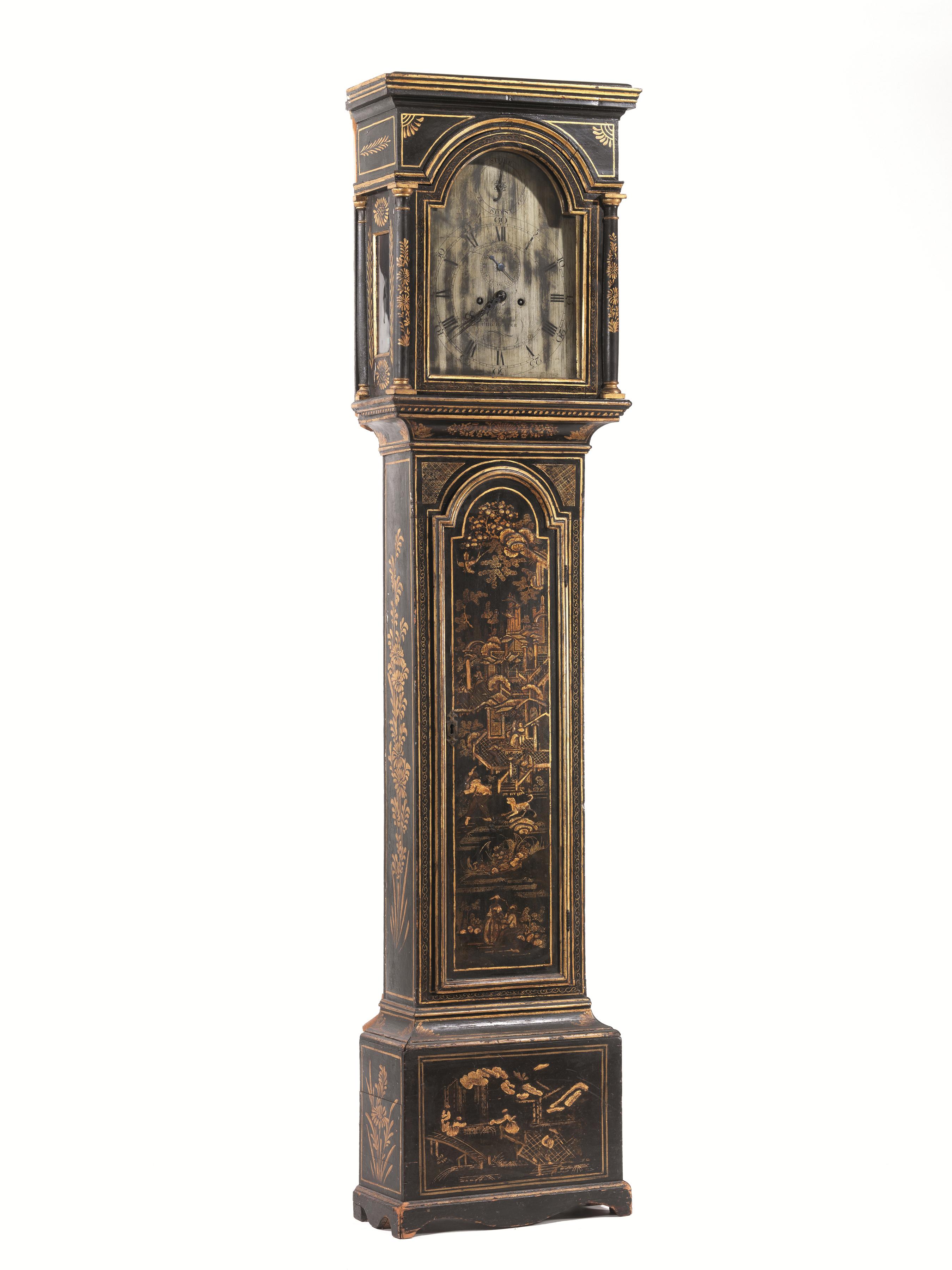 Orologio a colonna, Inghilterra, seconda metà sec. XVIII, in legno ebanizzato e dorato a chinoiserie, quadrante in metallo con numeri romani, firmato Price Chichester, alt. cm 210, meccanismo da revisionare, riprese alla doratura