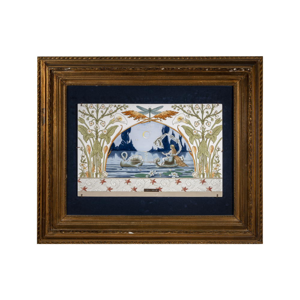 Placca in porcellana dipinta raffigurante "La leggenda di Leda ed il cigno"