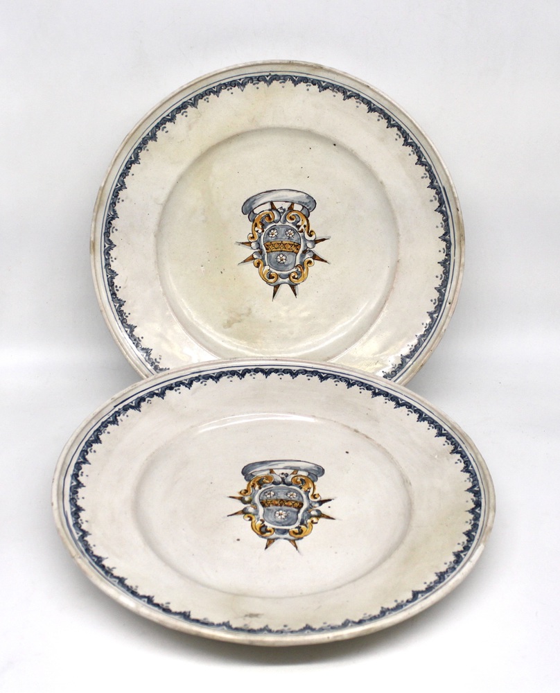 Coppia di piatti da portata in maiolica con stemma nobiliare al centro
