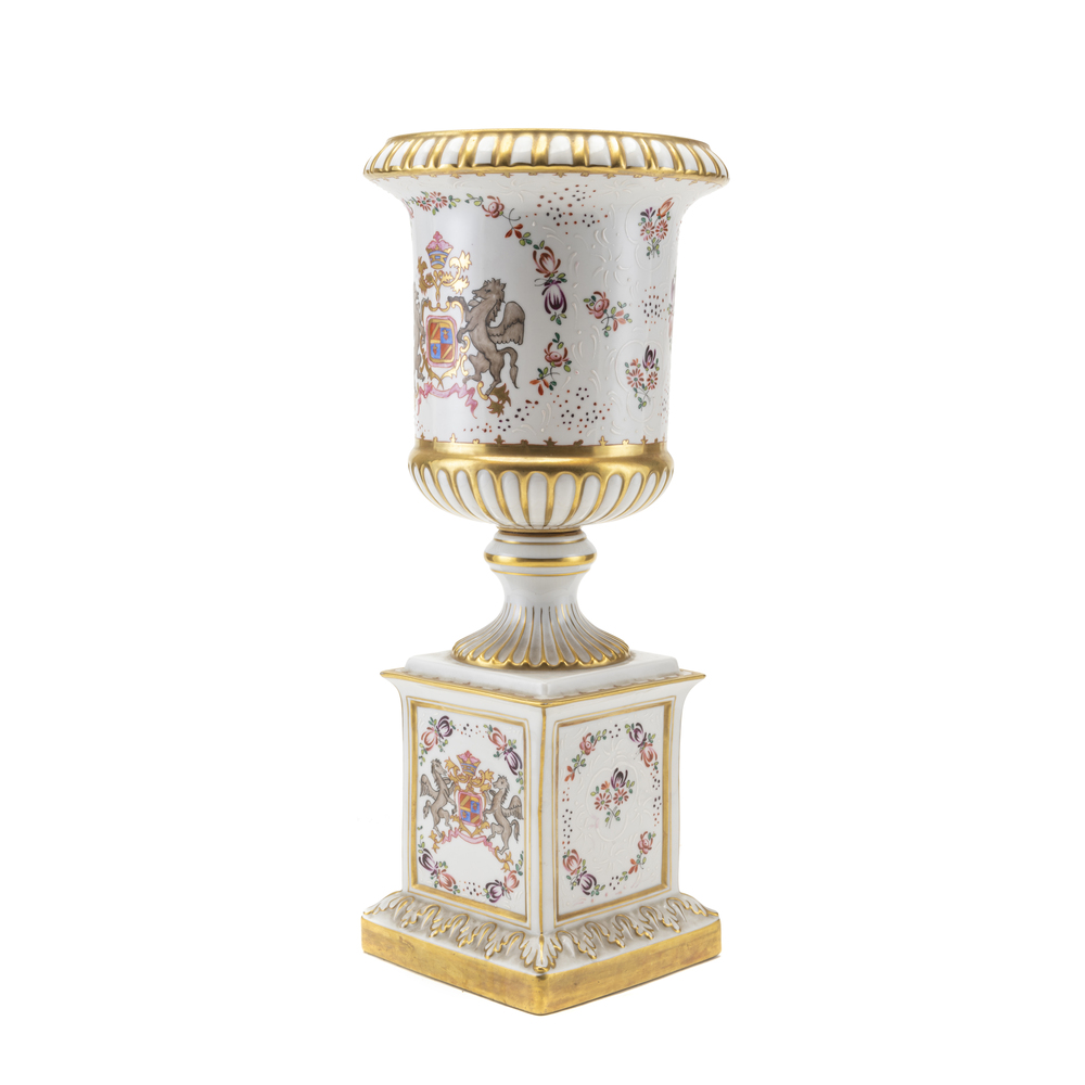 A white porcelain cup vase with gold finishes and noble coat of arms