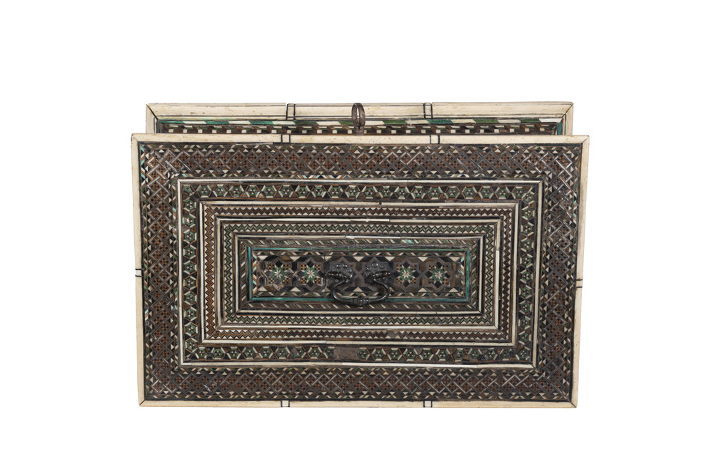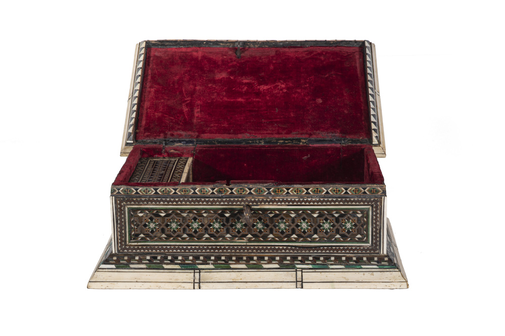 Intarsi in legni vari, corno, osso sia naturale sia tinto in verde