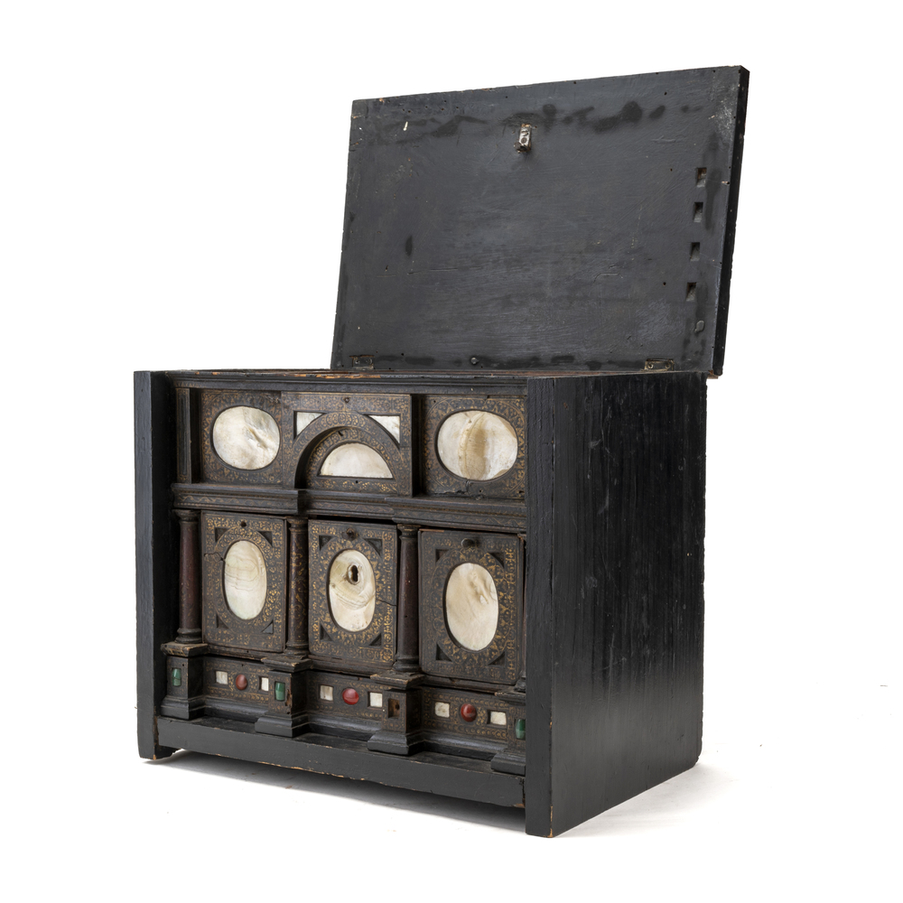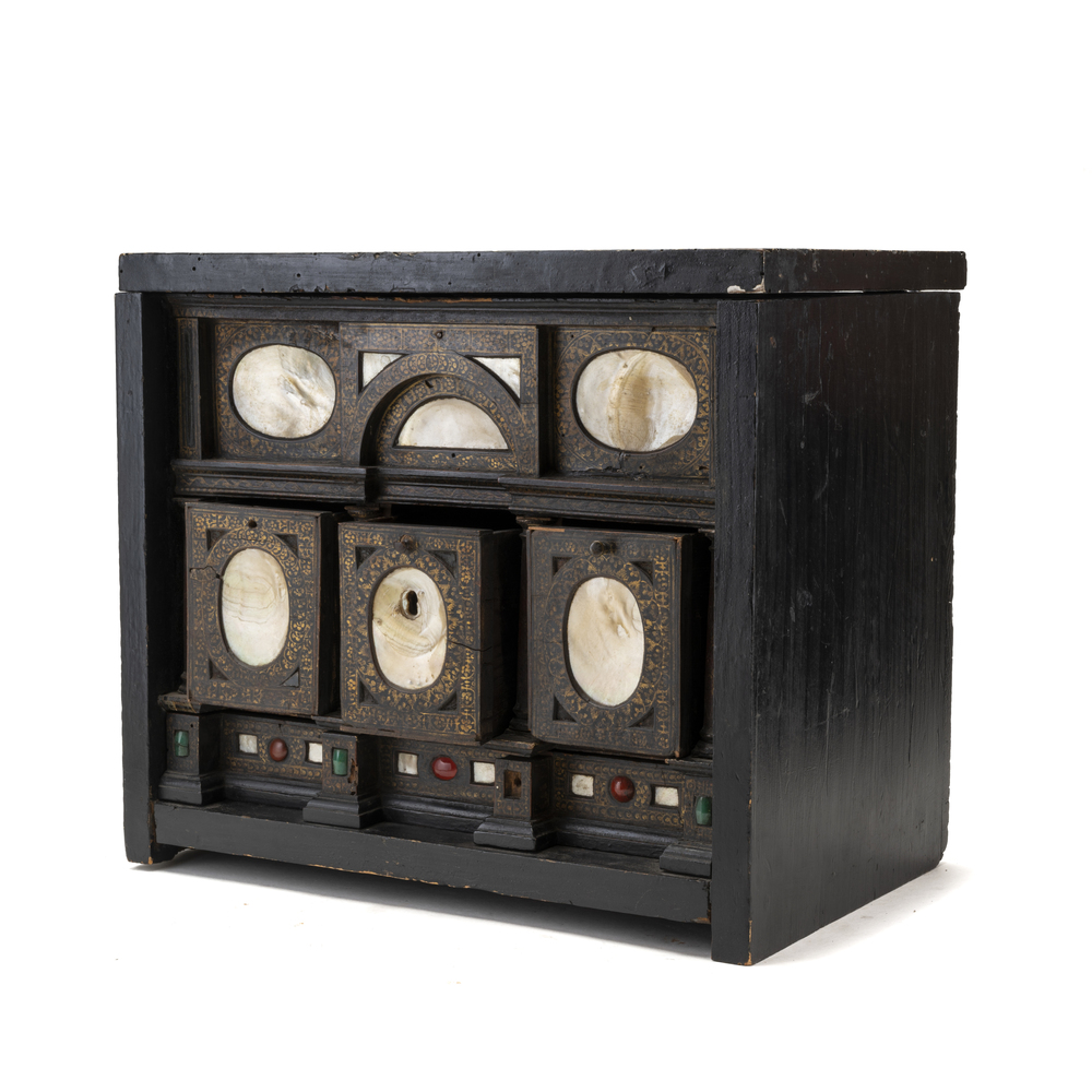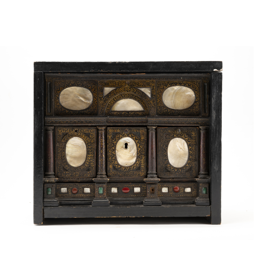 Stipo in legno ebanizzato con tre cassetti con decori dorati a motivo damaschino e placca in madreperla