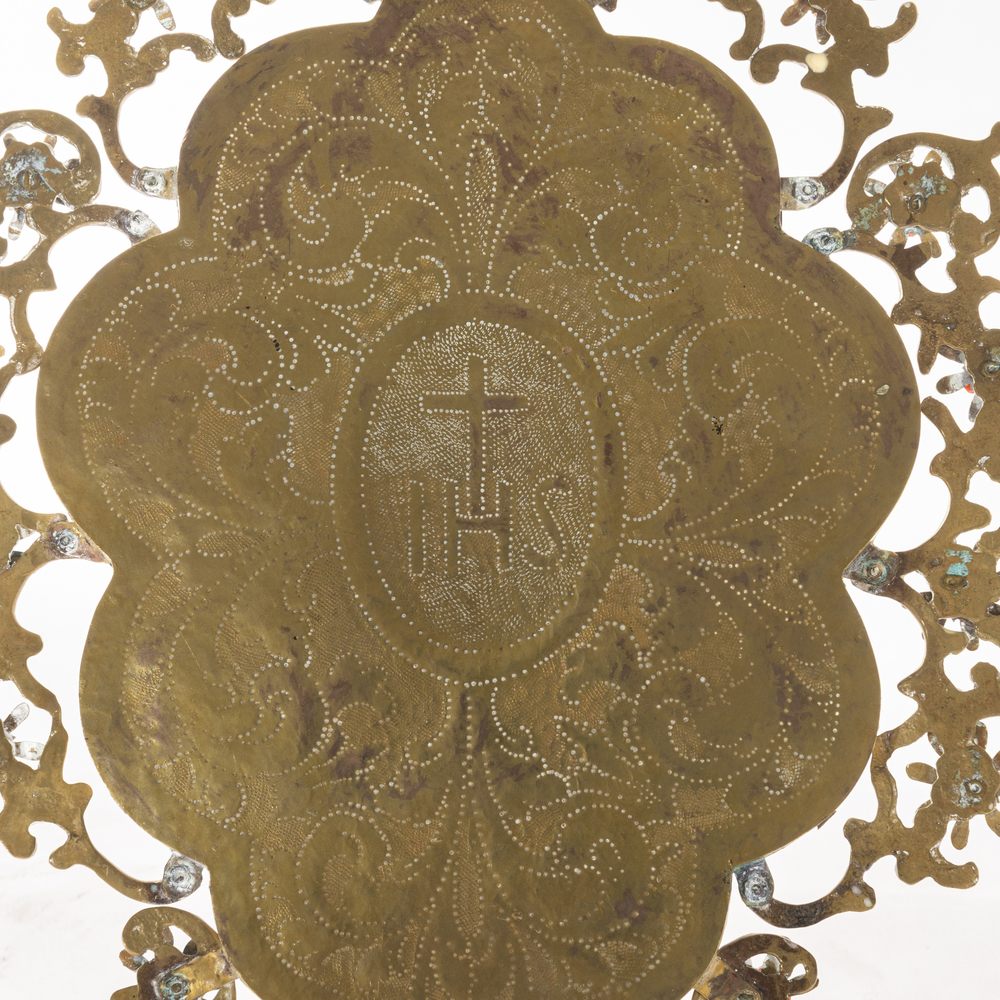 Exemplary in gilded and pierced bronze, with shaped corals set and in the center the figure of the Immaculate Conception