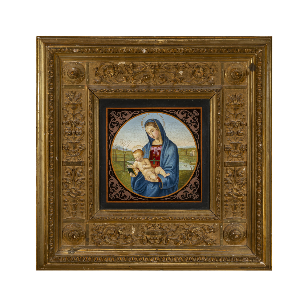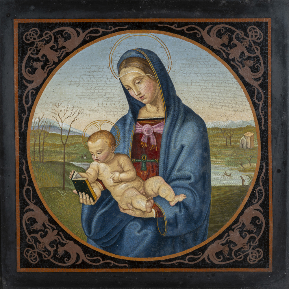 Placca in micromosaico su cassina di marmo nero del Belgio