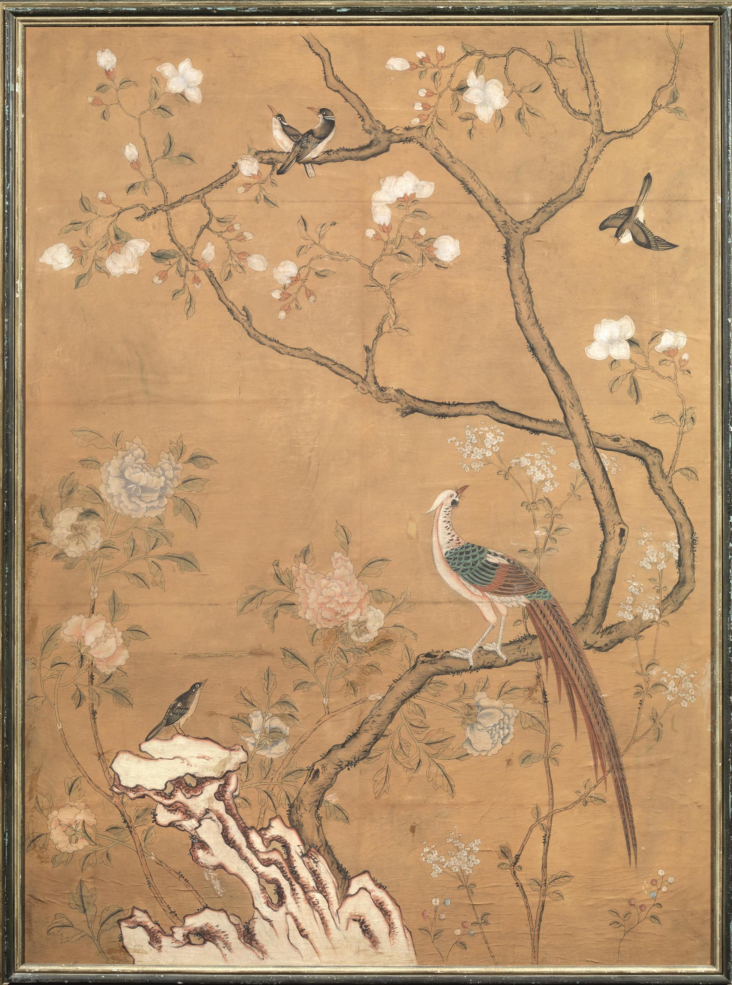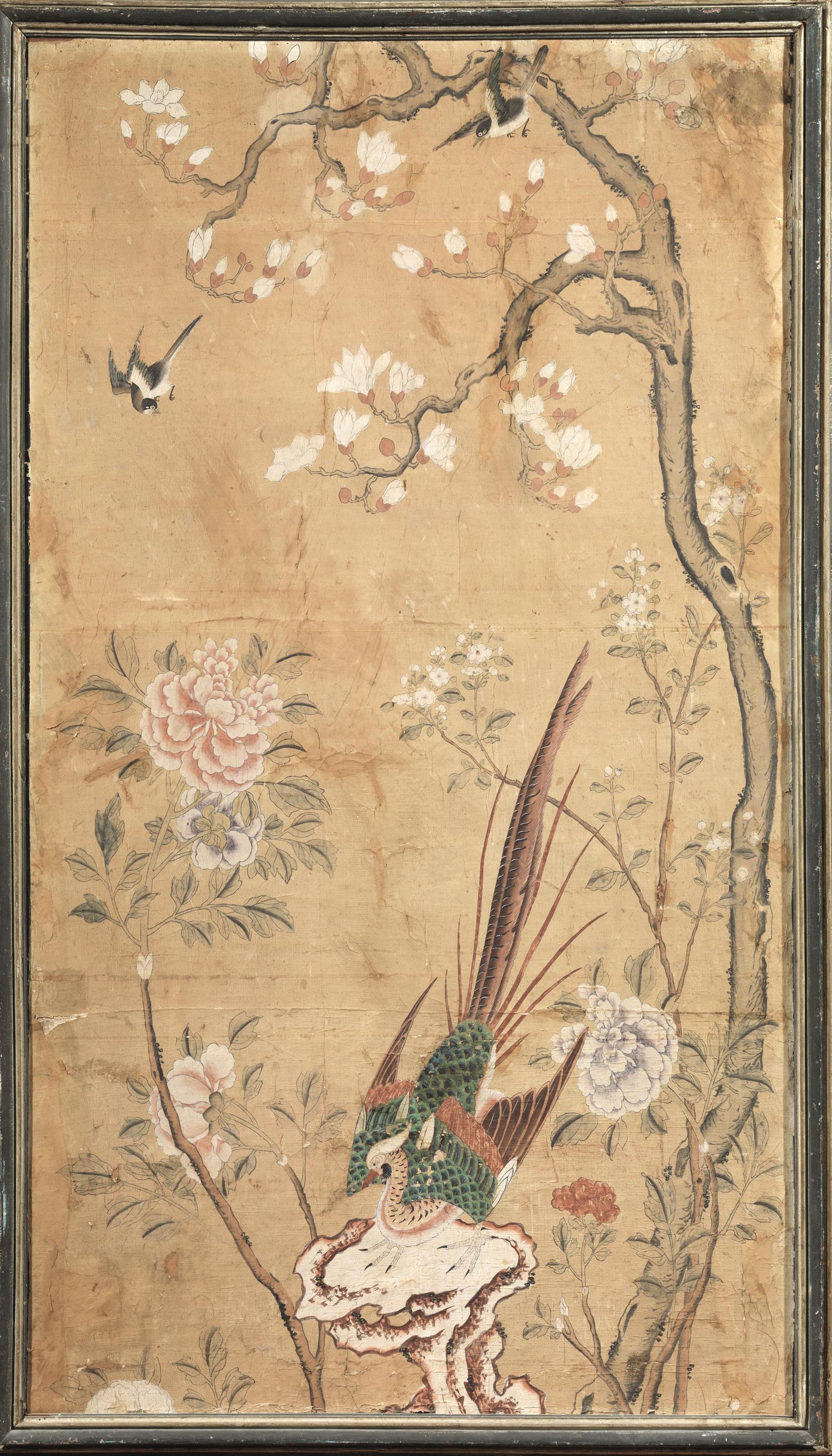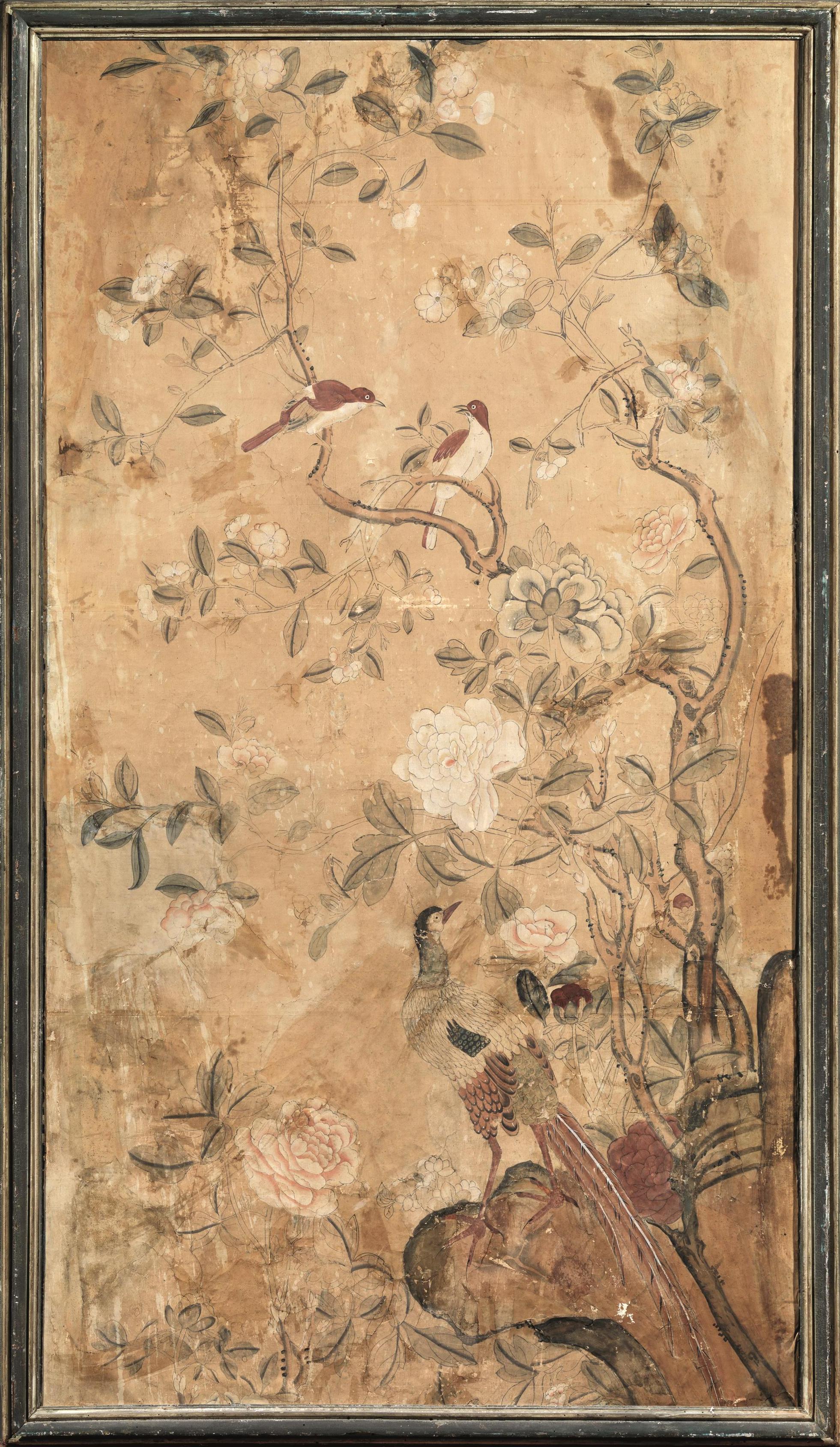 Scuola piemontese, sec. XVIII, tre pannelli a cineserie, due dei quali tempere su carta riportata su tela, cm 202x113 ed una carta su cartone cm 225x168, entro cornici (3)