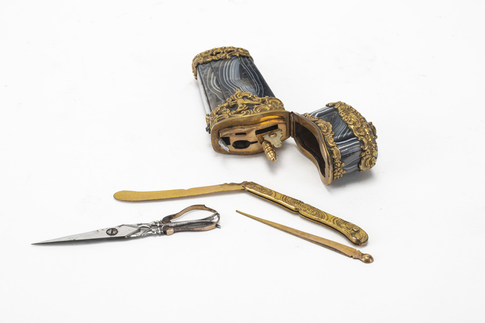An hard stone necessarie with gilt copper frame with rocaille motifs, scrolls and animals