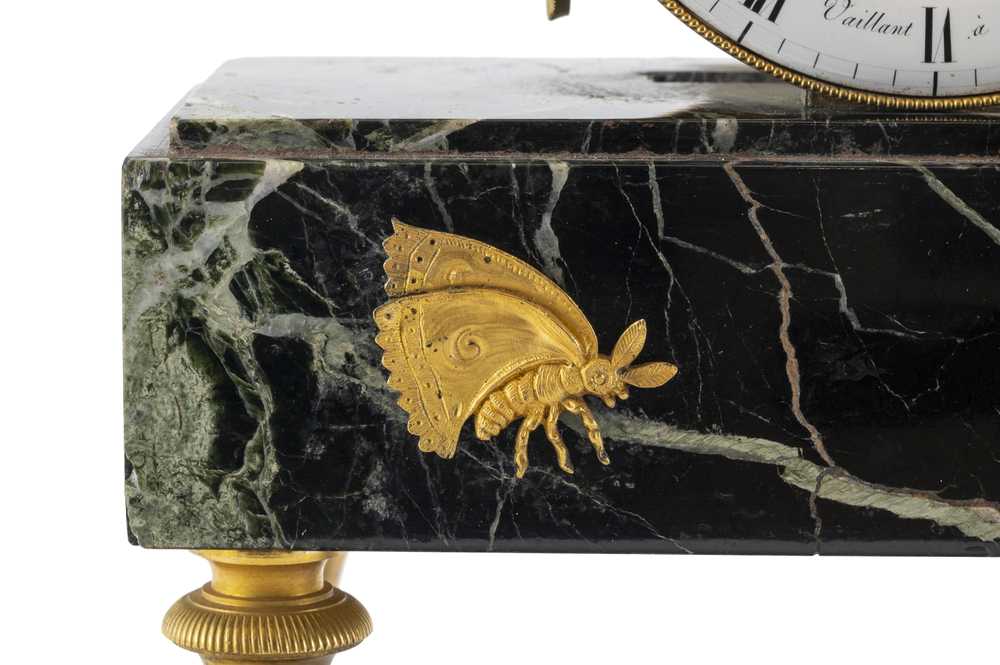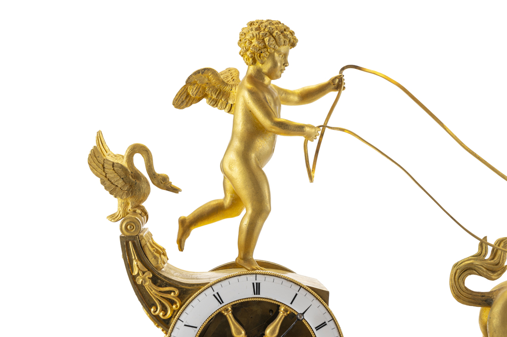 A fine quality and important French Empire clock in the shape of a classical chariot, with Cupid acting as the charioteer. The case is green portoro marble, with very fine ormolu decorations and a white enamel dial obtained from the wheel of the chariot. Finely chiseled ormolu friezes, in the shape of butterflies and of bow-and-arrows, decorate the front of the pedestal. Signed Vaillant à Paris on the dial. The movement is partially visible through the wheel; striking hours and half hours. For similar clocks in horological literature, see: "Pierre Kjellberg, La Pendule Française du Moyen Age au XXème Siècle", p. 417. France, early 19th century