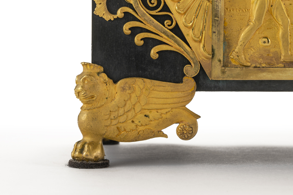 The clock stands on four ormolu feet in the shape of mythological monsters, as winged heads of lions.