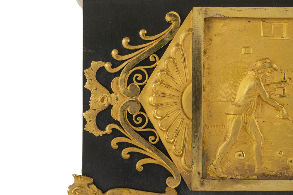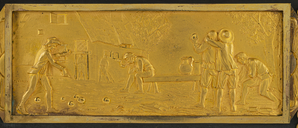 An important ormolu and dark patina French mantel clock, portraying two countrymen playing cards. The quality of the sculpture is very high, both in its design and its implementation. The composition stands on a pedestal whose frontal part is decorated by a very fine bas-relief ormolu plaquette. The bas-relief portrays a group of men playing pétanque, the traditional French game similar to lawn bowling.