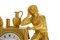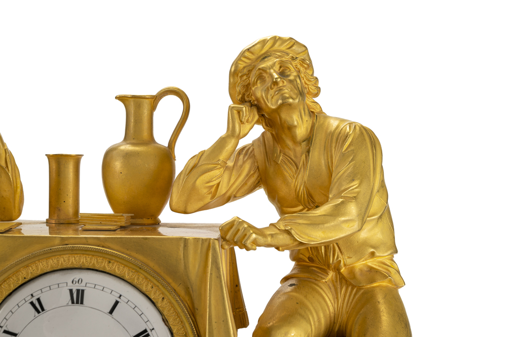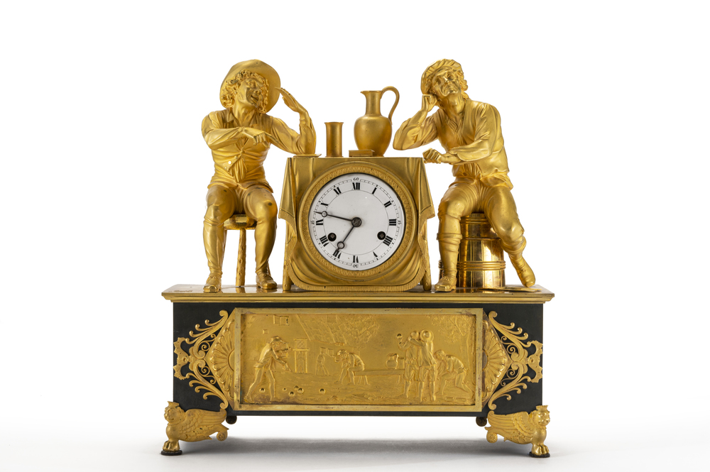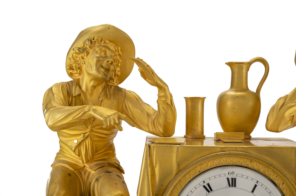 Importante orologio da appoggio francese in bronzo dorato al mercurio ed in patina scura, raffigurante due giocatori di carte. Il gruppo scultoreo è realizzato in tuttotondo, con grande vivacità e poggia su plinto decorato con placchetta in bassorilievo, sempre dorata al mercurio. Il tutto denota grande finezza, sia nel modellato che nella realizzazione. La placchetta posta frontalmente sul plinto ha per soggetto dei giocatori di pétanque, il tradizionale gioco di bocce francese.