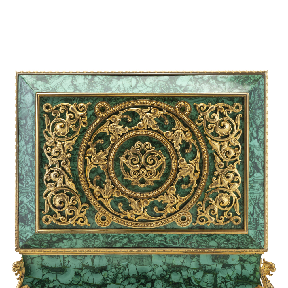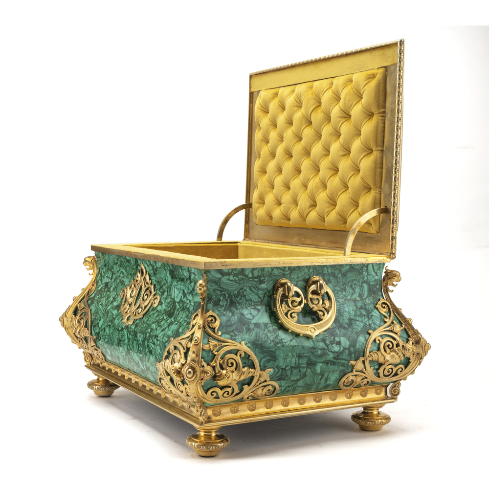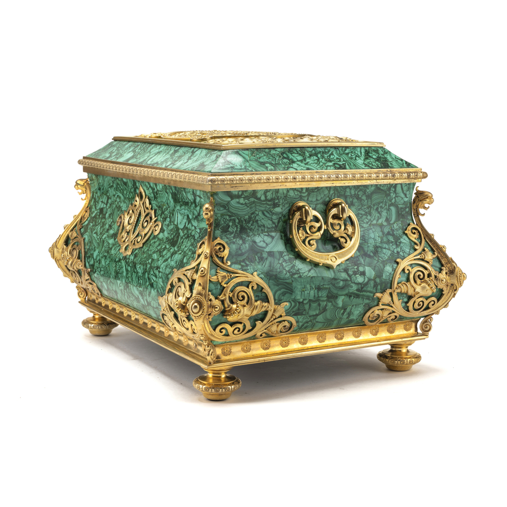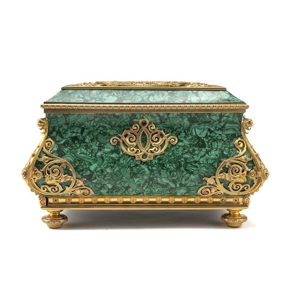 Raro cofanetto in malachite con applicazioni in bronzo dorato