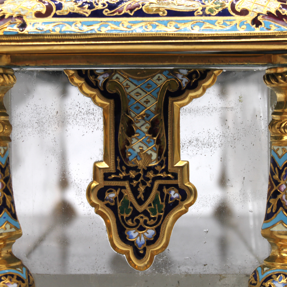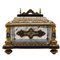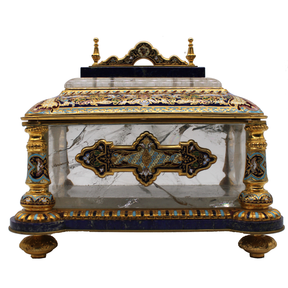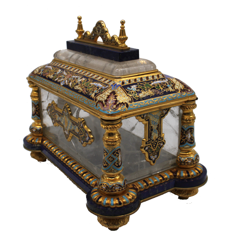 Portagioie in cristallo di rocca con montatura in bronzo a decori smaltati e parti in lapis, montanti decorati a motivo fogliaceo